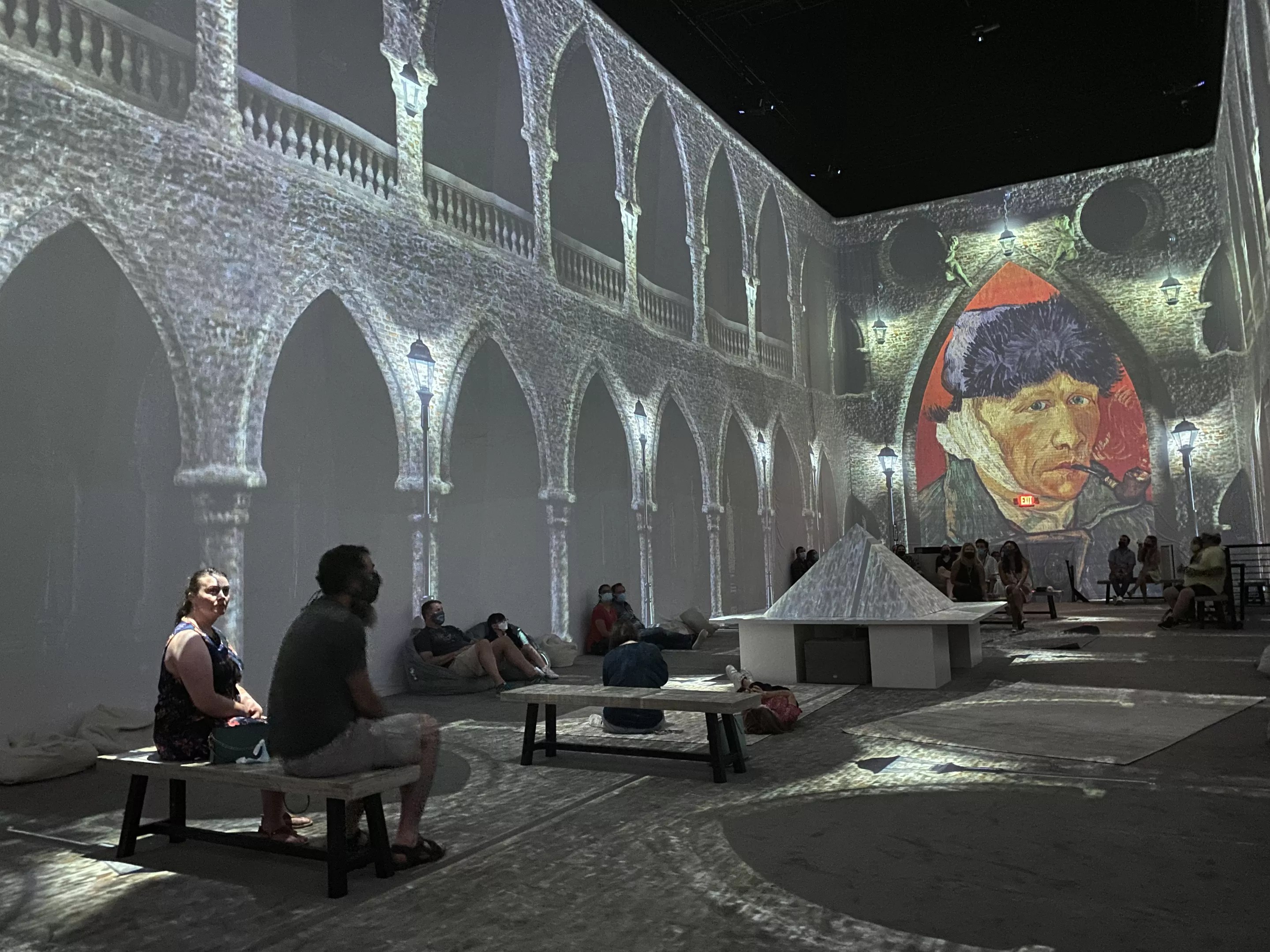 Dallas Van Gogh has chairs and stools and you can stand or sit directly on the floor. If you purchased a Premium Flex or VIP Flex ticket, they give you a personal cushion before entering the exhibition.