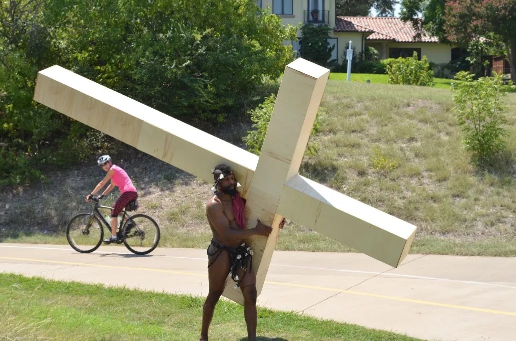 Barefoot, nearly naked, sweating and seemingly disoriented, local artist Xxavier Carter carried a heavy weight on his shoulder during his Saturday performance of “Sweet Jesus.” He walked 10 miles from The Great Trinity Forest to White Rock Lake wielding a wooden cross almost twice his size. The performance was a re-creation of his 2012 work “Jazz, Jesus, Jazz,” which took place in San Francisco.