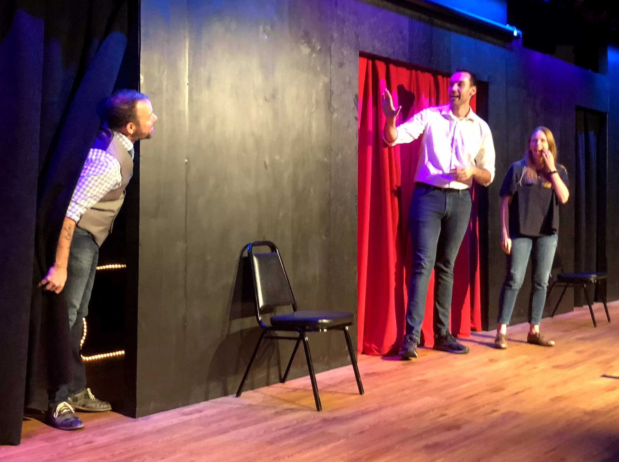 Members of the Dallas Comedy Club house improv troupe Jerry! including (left to right) Chad Cline, Dane Robertson and Katy Evans perform a scene during a special preview night of the new Deep Ellum comedy space on Elm Street.