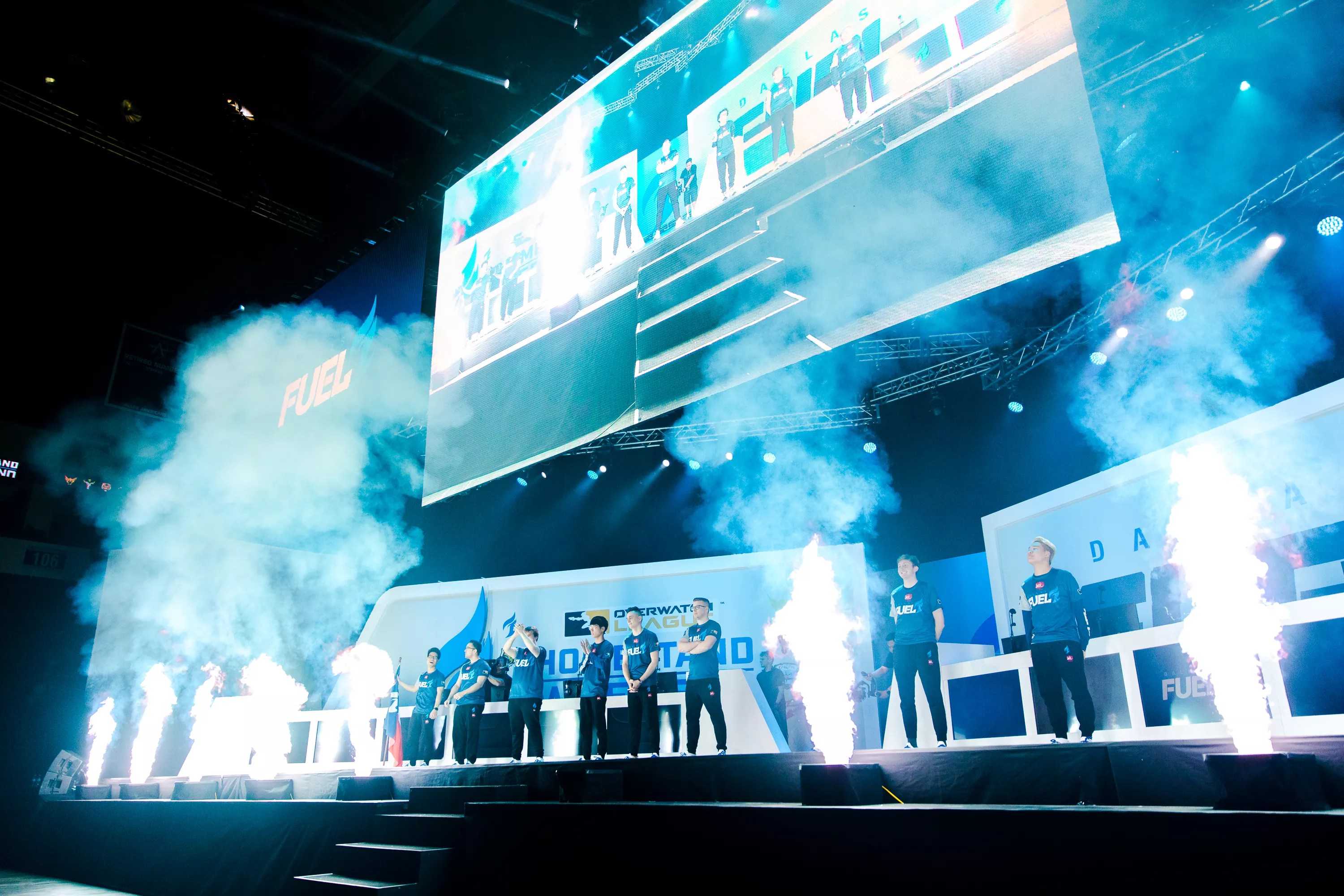 The Dallas Fuel received pyrotechnics, smoke and fanfare as they took the stage for their first ever home game.