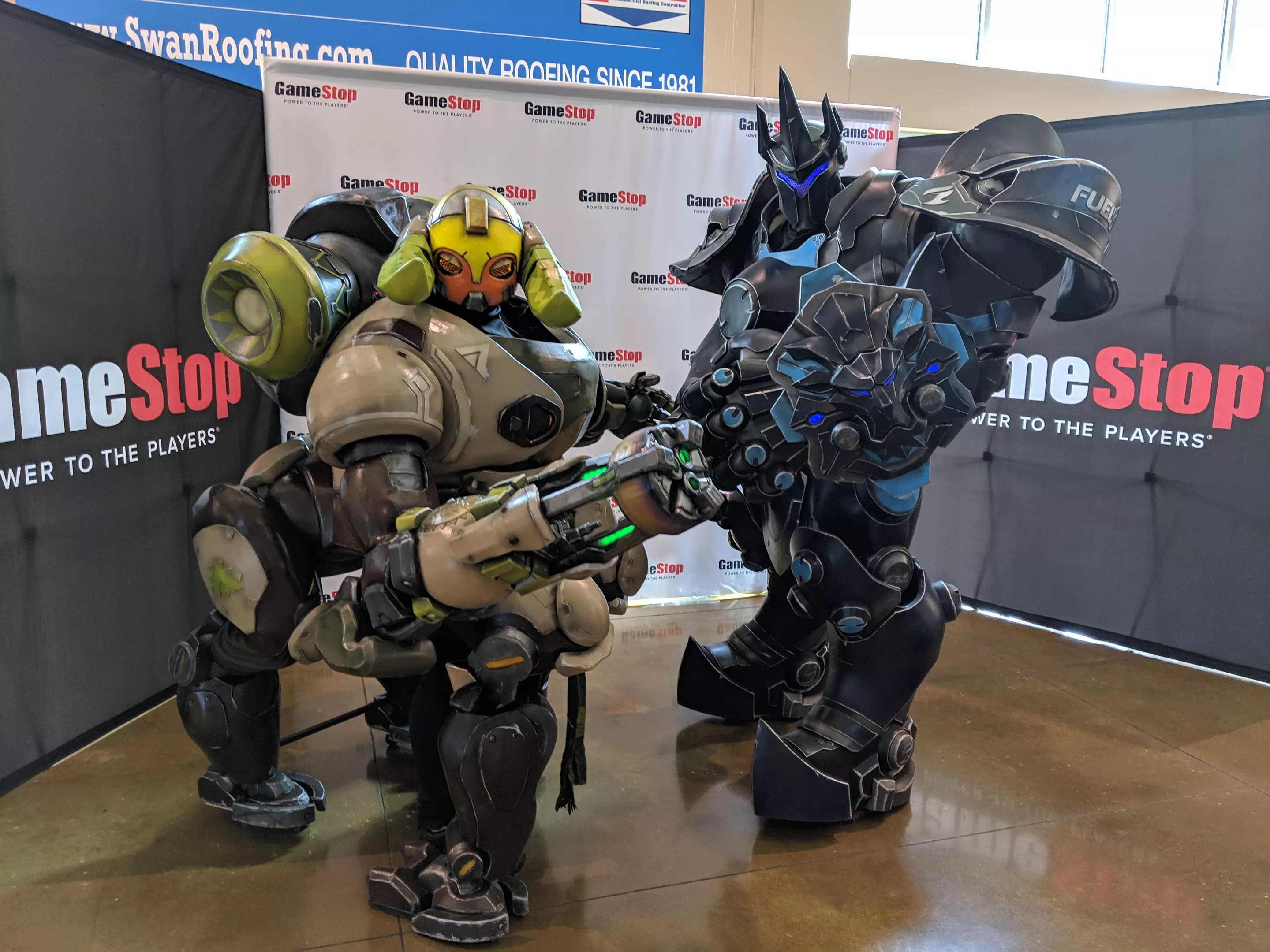 Frostbite Cosplayers as Overwatch Characters Orisa and Reinhardt, respectively.