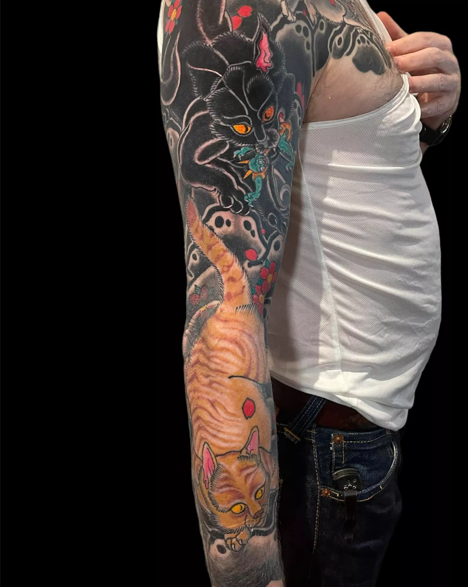 “This client wanted a Japanese-style tattoo sleeve, but with cats. And this is what I came up with.” (See photo below.)