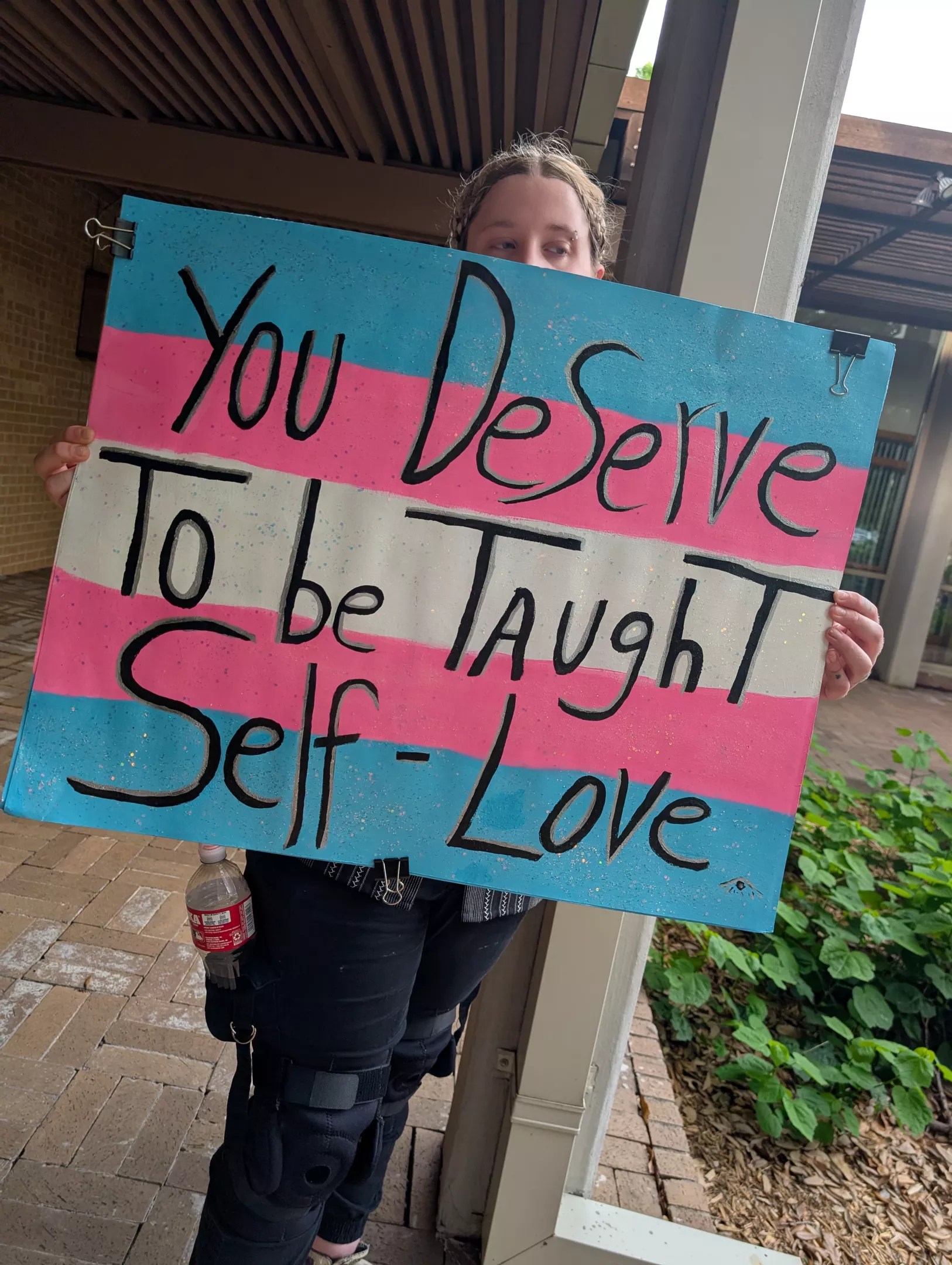Rally attendees at Denton Pride event carried various signs in support of the LGBTQ+ community.