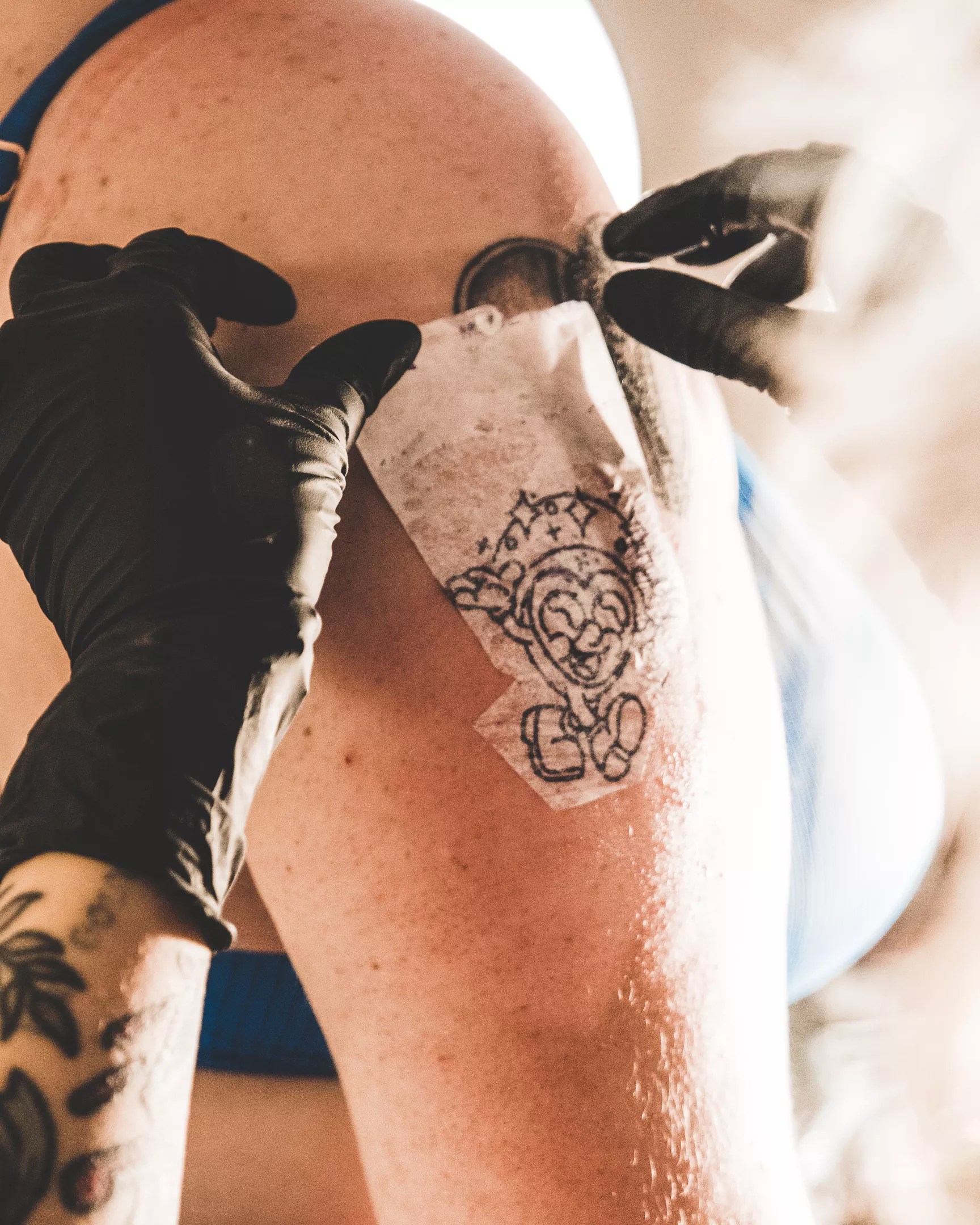 Taylor Renz applying one of the custom flashes for the tattoos being done out in the trailer at Double Wide during the Pride Kick-Off party by the Third Eye Gallery shop