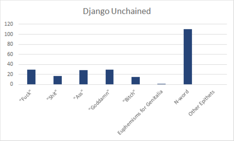 110 usages of the N-word is staggering, but with only one euphemism for genitalia in Django Unchained, it’s safe to say that the ‘D’ was definitely silent. Ba dum… Tss!