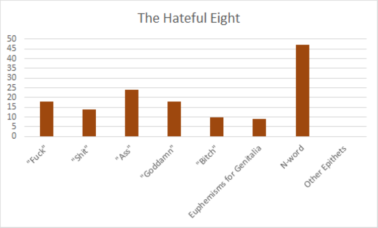 The Hateful Eight uses the word “fuck” only 18 times, but the N-word usage is almost on-par with that of its predecessor. Nine euphemisms for genitalia have been used in this film, and the lion’s share of those include a scene in which Samuel L. Jackson’s character says “pecker,” “dingus” and “johnson.” That same character later gets shot in the testicles.