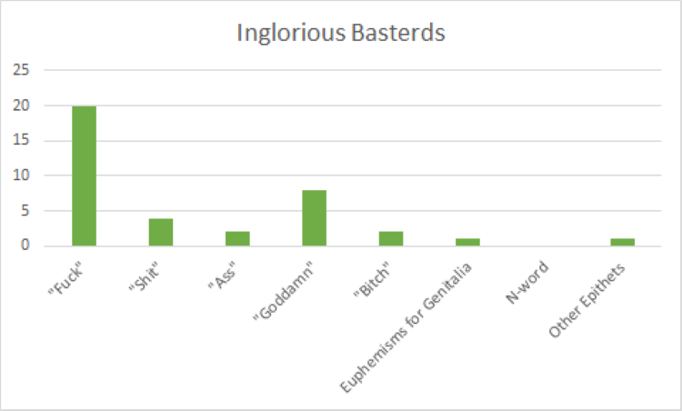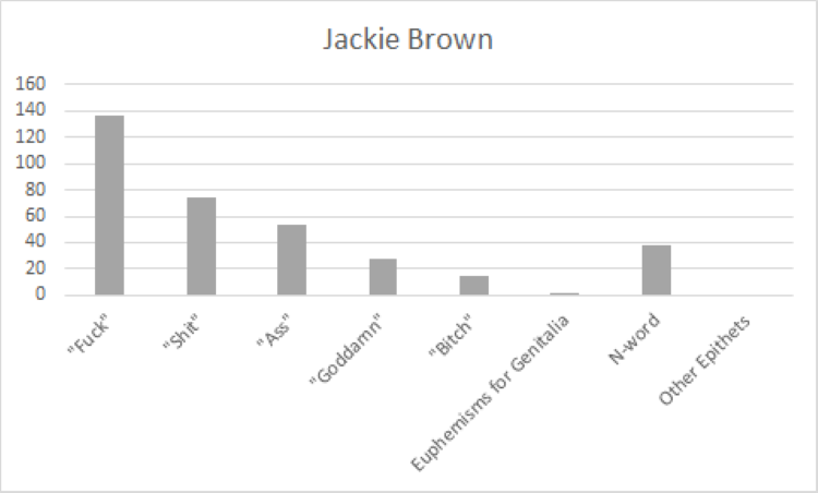 As you can see, this movie has a rather gratuitous use of the word “fuck.” Not exactly unprecedented for Tarantino, but still an astonishing number. You may also notice that his infamous use of the N-word is not found once in this movie. Maybe Spike Lee finally got through to him after all these years.