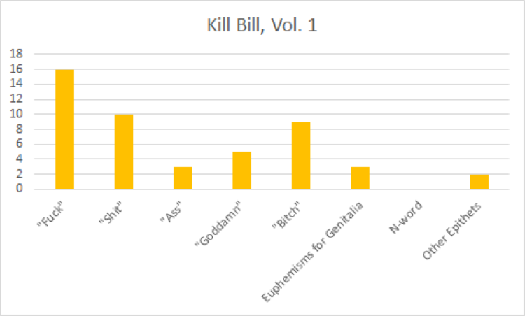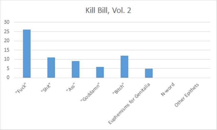 In Kill Bill, Vol. 2, the word “fuck” is used at a more gratuitous count of 26. You’d use that word more generously, too, if you had your eyeball ripped from its socket.