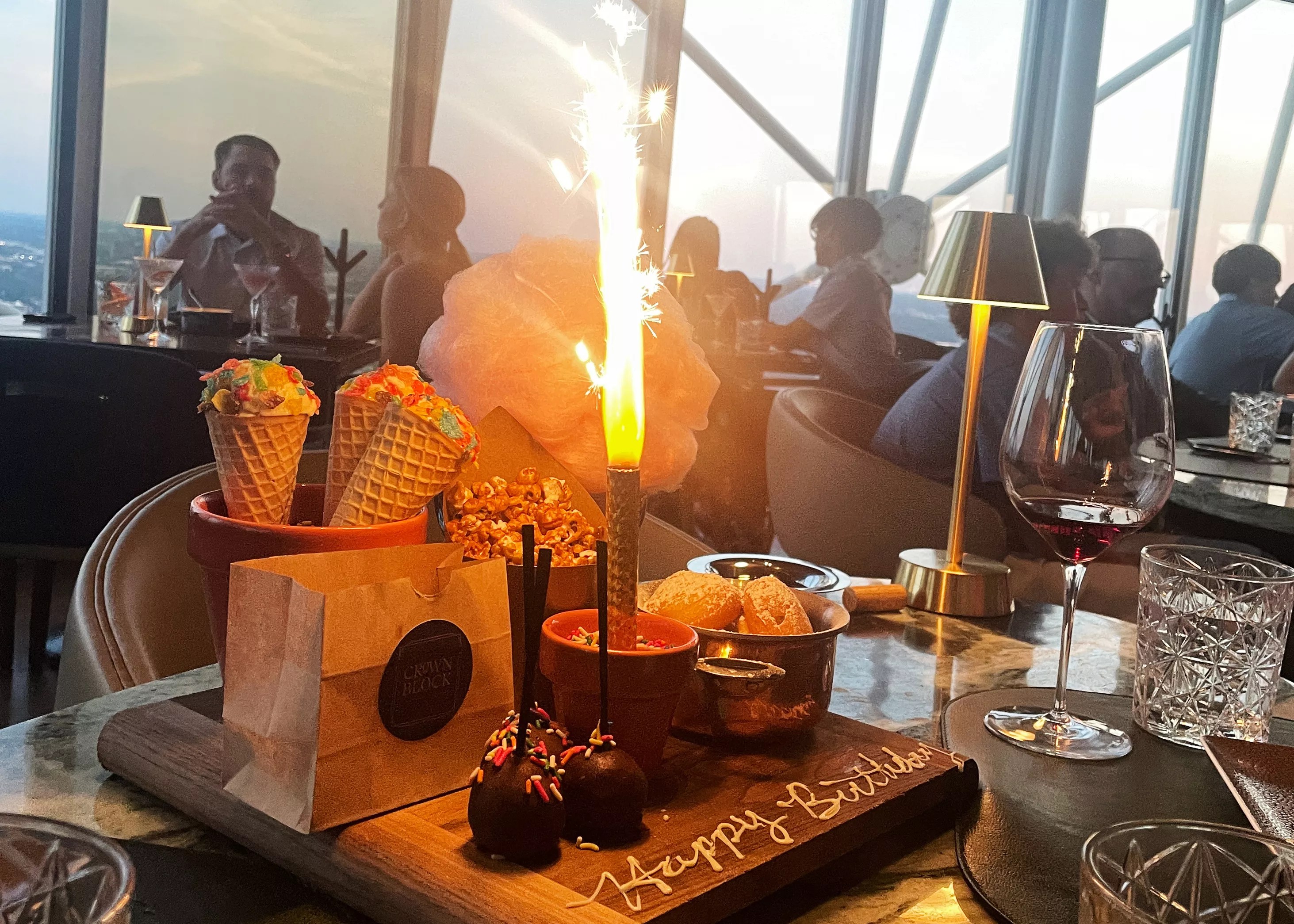 300 Reunion Blvd. The dining room at Crown Block is a classy and seductive dining room with people dressed in their finest attire. Which means a foot-high sparkler shooting out of this birthday dessert platter is the perfect way to make everyone else’s dinner conversation about you. The $30 dessert is called the Dessert Storm, and it comes with cinnamon doughnut holes, caramel corn, fruity pebble ice cream cones, cake pops and cotton candy framing a lit sparkler held up by sprinkles in the center.