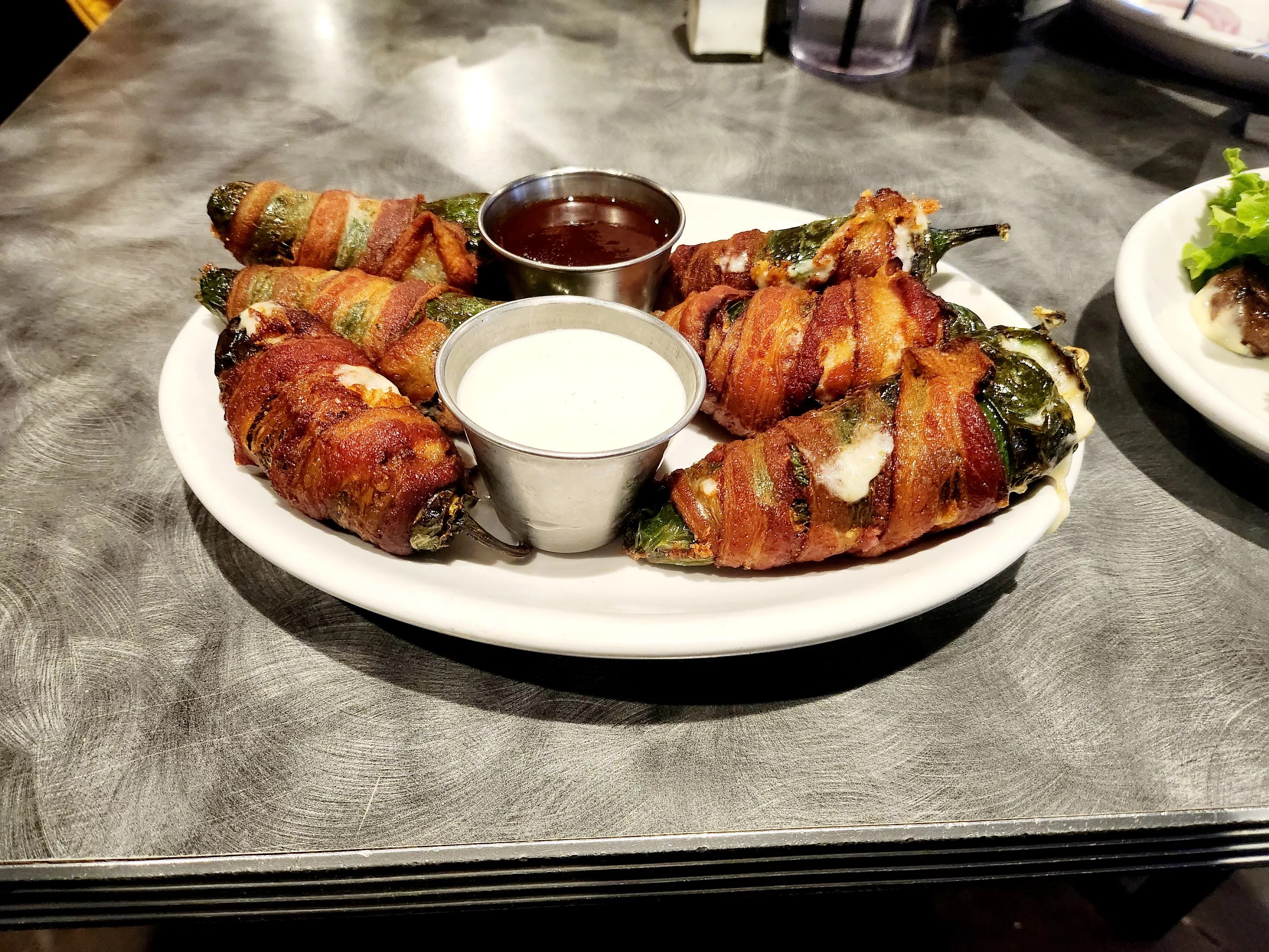 Bacon-wrapped, cheese-stuffed jalapenos.
