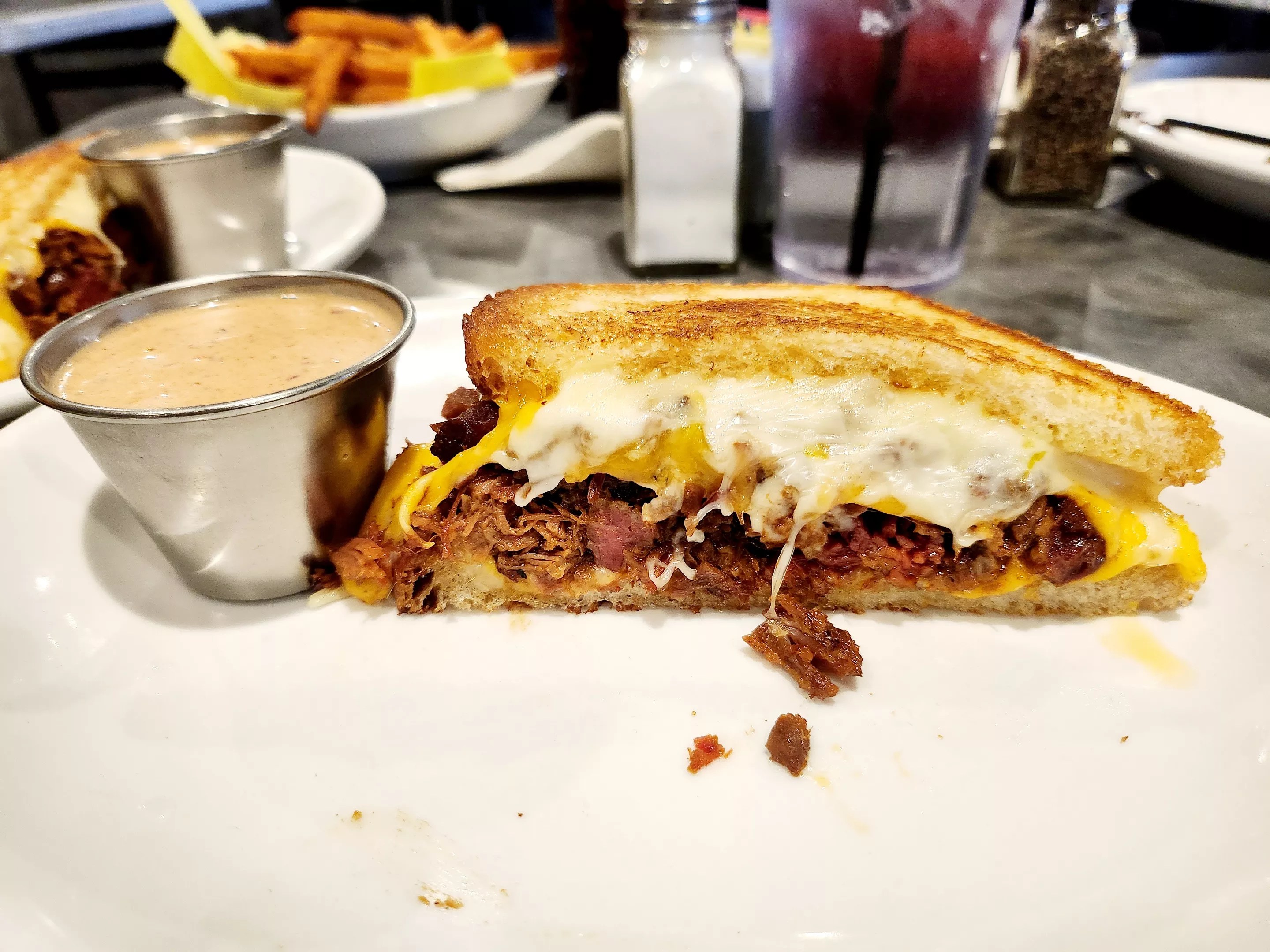 In addition to its stacked 13-burger-deep roster, Kenny’s Burger Joint has four sandwiches on the menu: Southern fried chicken, the “Big Dog” (an extra-large hot dog on a poppy seed bun that you can customize with numerous toppings), Kenny’s Steak Bomb hoagie with shaved ribeye, mushrooms, onions, peppers and provolone, and lastly, a smoked brisket grilled cheese ($12.99). We opted for the last, which features three cheeses (cheddar, pepper Jack and white American) and a layer of slow-smoked tender brisket on perfectly grilled sourdough slices.