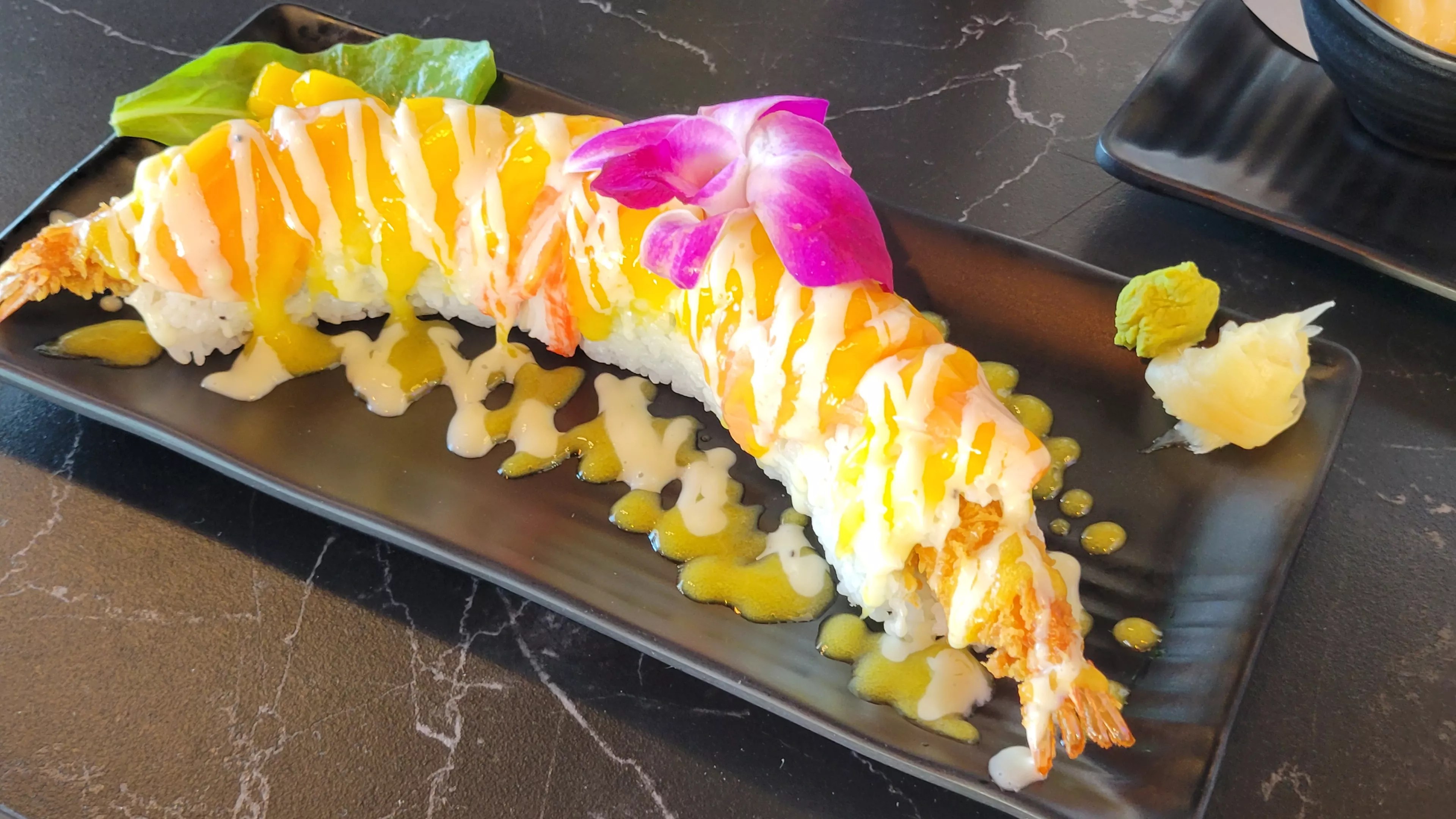 The sushi rolls were beautifully plated and very delightful. The 206 Luster roll is elaborately made with shrimp tempura, crab and salmon layered with sweet mango and a creamy mango sauce, all of which works beautifully together.