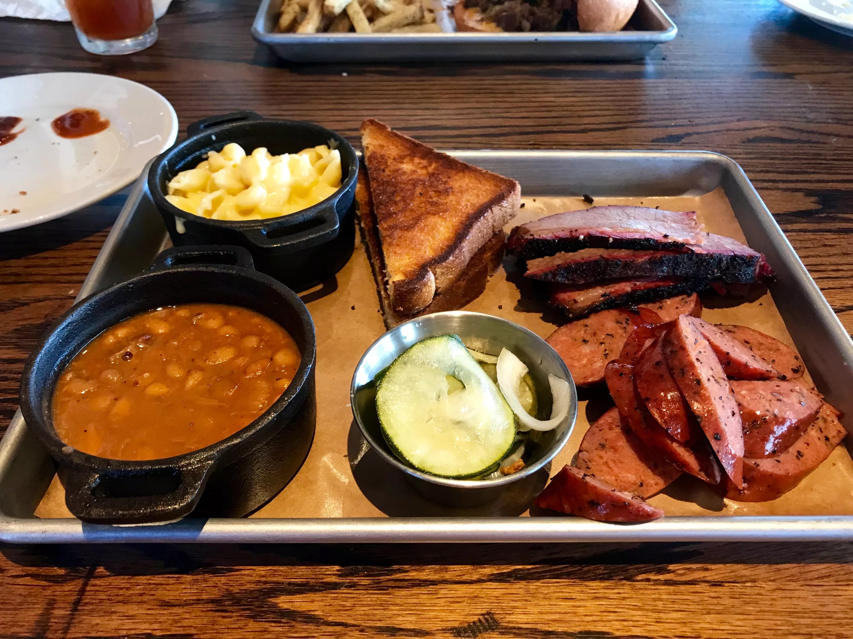 Each table is equipped with three varieties of barbecue sauce, and with the brisket and pork both in need of sauce enhancements, diners should have plenty of opportunities to pick a favorite. The sides, served in their Lilliputian cast-iron dishes, are solid choices, however. The sharpness of the smoked cheddar stood out in the miniature pasta shells and cheese, and the barbecue beans hit the tangy bullseye as well.