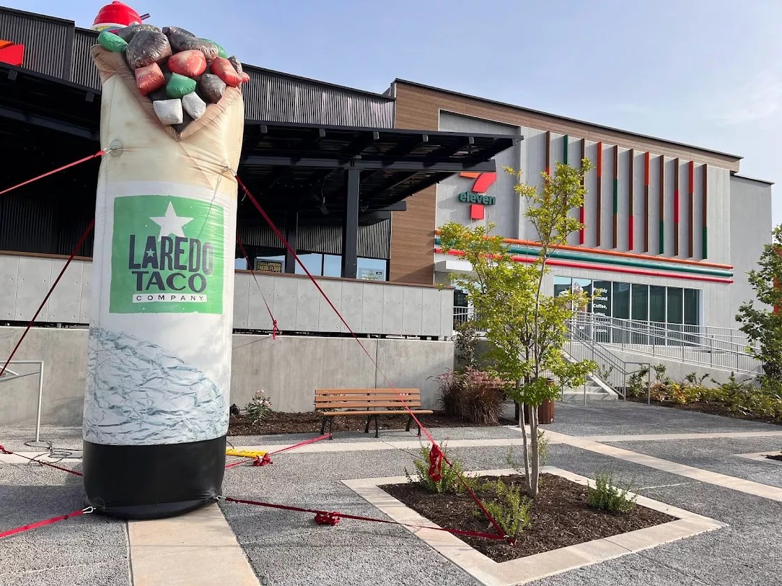 A big, inflatable burrito greets guests of the new 7-11 concept at the corner Preston and Alpha Road that houses the Laredo Taco Company restaurant.