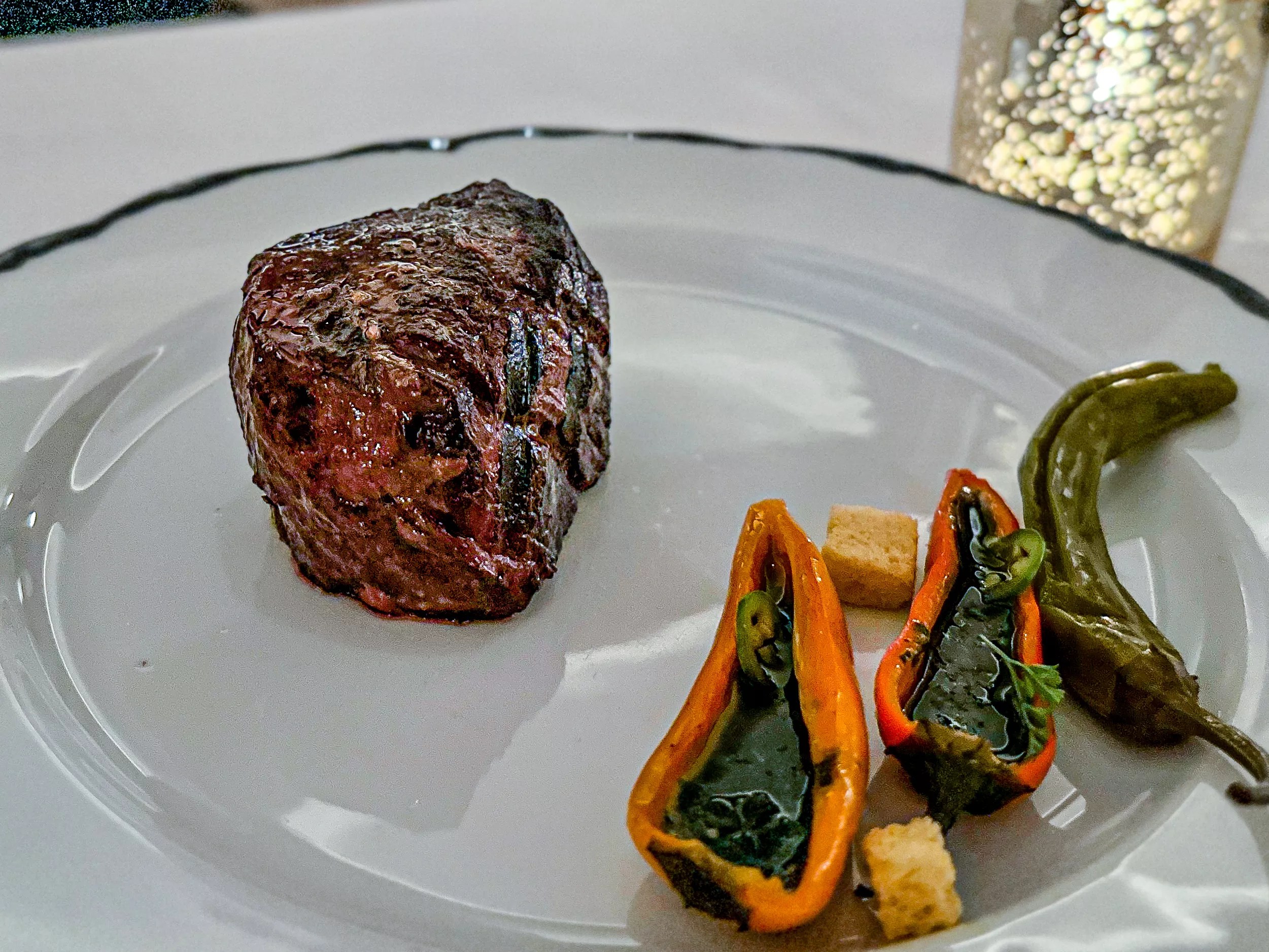 The filet was a 6-ounce cut of 100% grass-fed beef from Australia. It was an undercooked medium with a slightly caramelized crust that, while good, was not remarkable. It was served with a medley of roasted peppers.