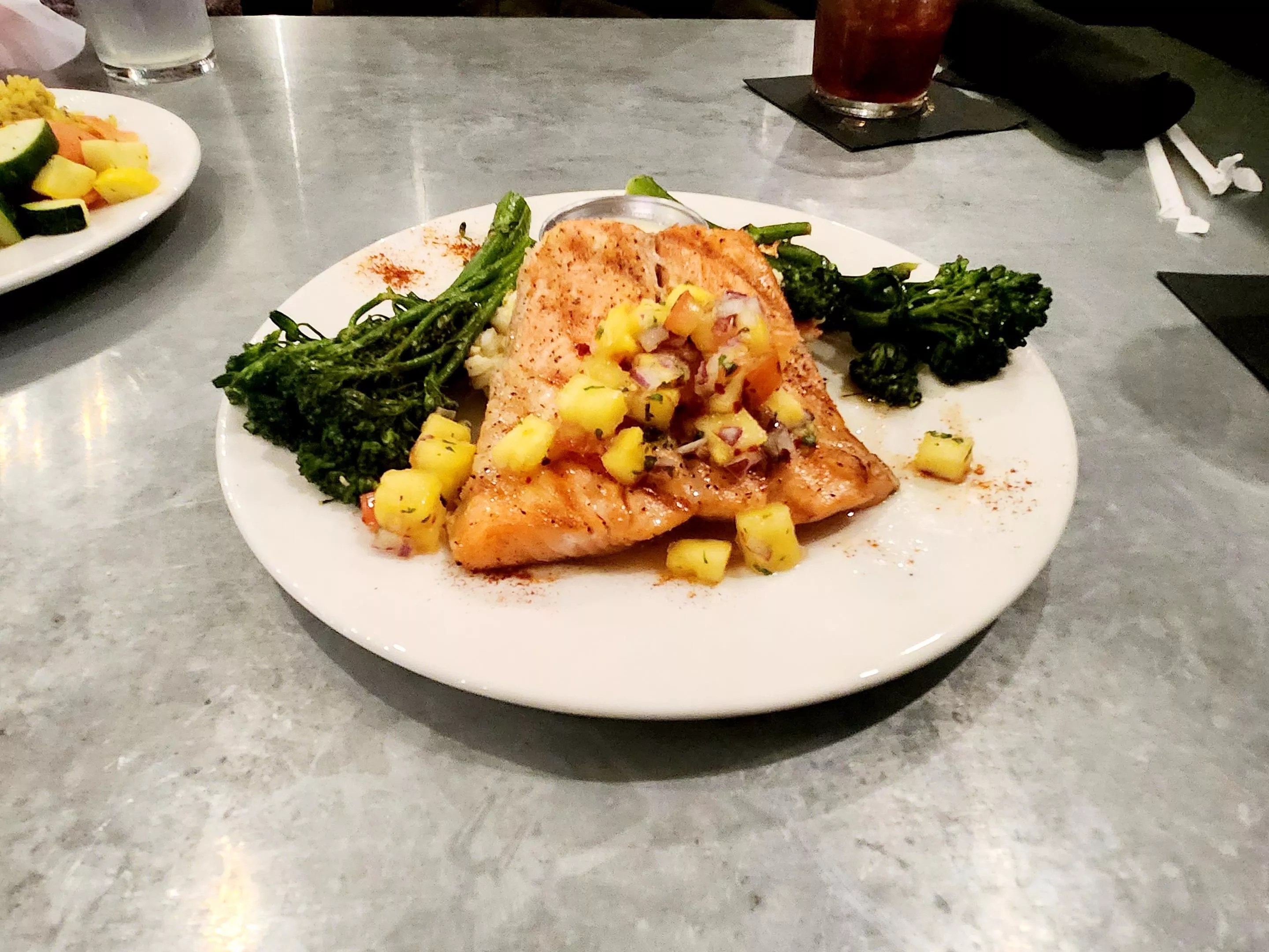 We tried two entrees: First was a plate of steelhead trout ($22) topped with pineapple salsa over a bed of mildly sweet, extra creamy risotto and served with a side of broccolini.