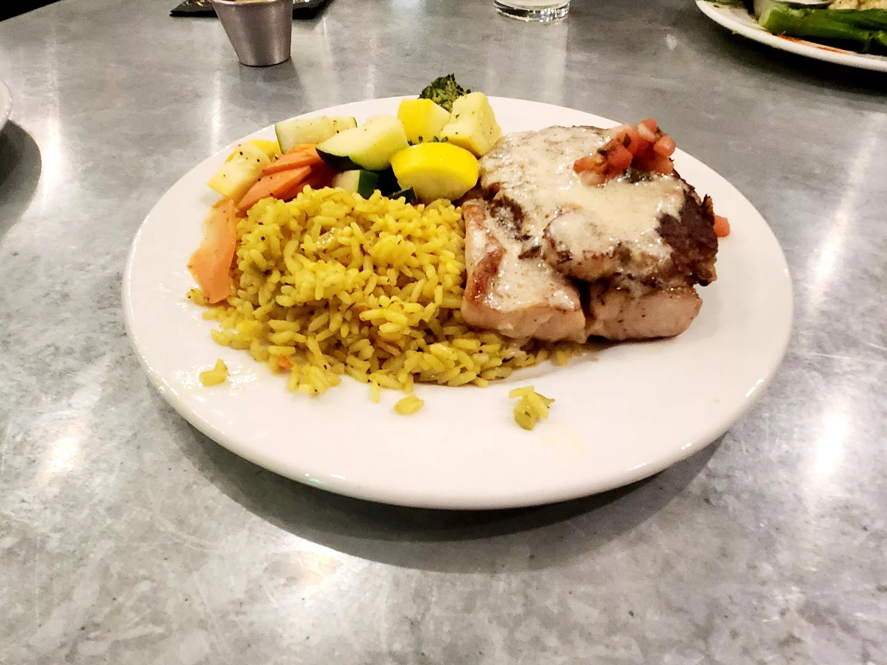 Next, a dish of shrimp, crab and andouille stuffed mahi ($23) served alongside fresh vegetables and rice.