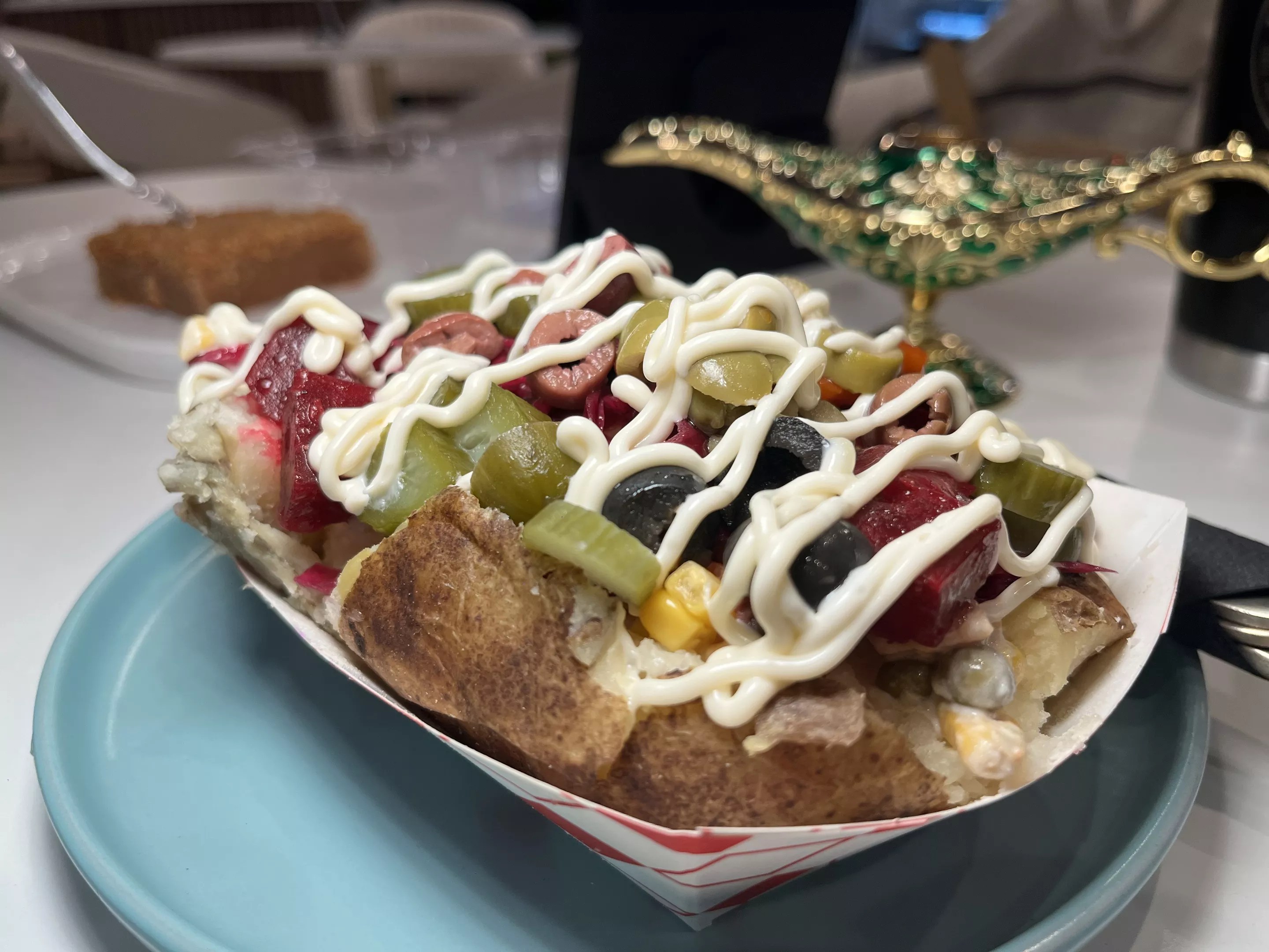 The Kumpir is a popular Turkish snack: a soft-baked potato topped with pickled vegetables and mayonnaise.