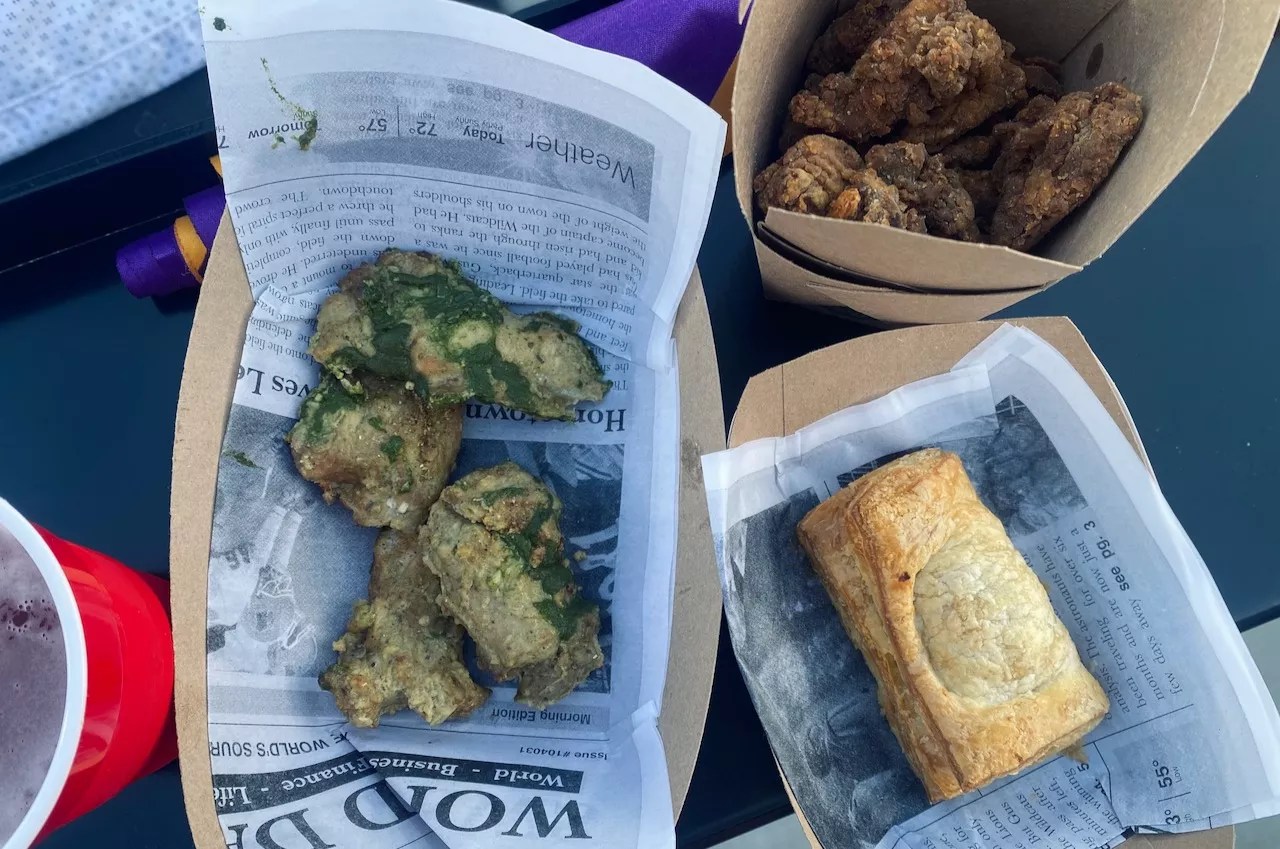 The samosas are finished off in the fryer when ordered for perhaps one minute, maybe less. It’s quick so you’re not standing in line for long, but long enough so that it’s hot when bitten into. After so much chicken we went with a vegetable samosa, filled with peas, potatoes and onion. A dab of green chili on the side would have topped it off but, alas, we can’t be so picky when out at the sports. We were mostly happy we weren’t waiting 20 minutes for a dry, boring $27 pretzel.
