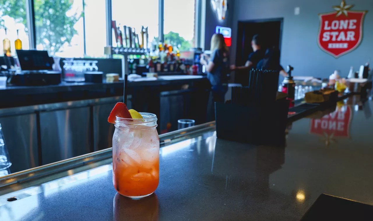 The Little Elm location also has a full-service bar with local drafts on tap and cocktails, like this Strawberry Collins.