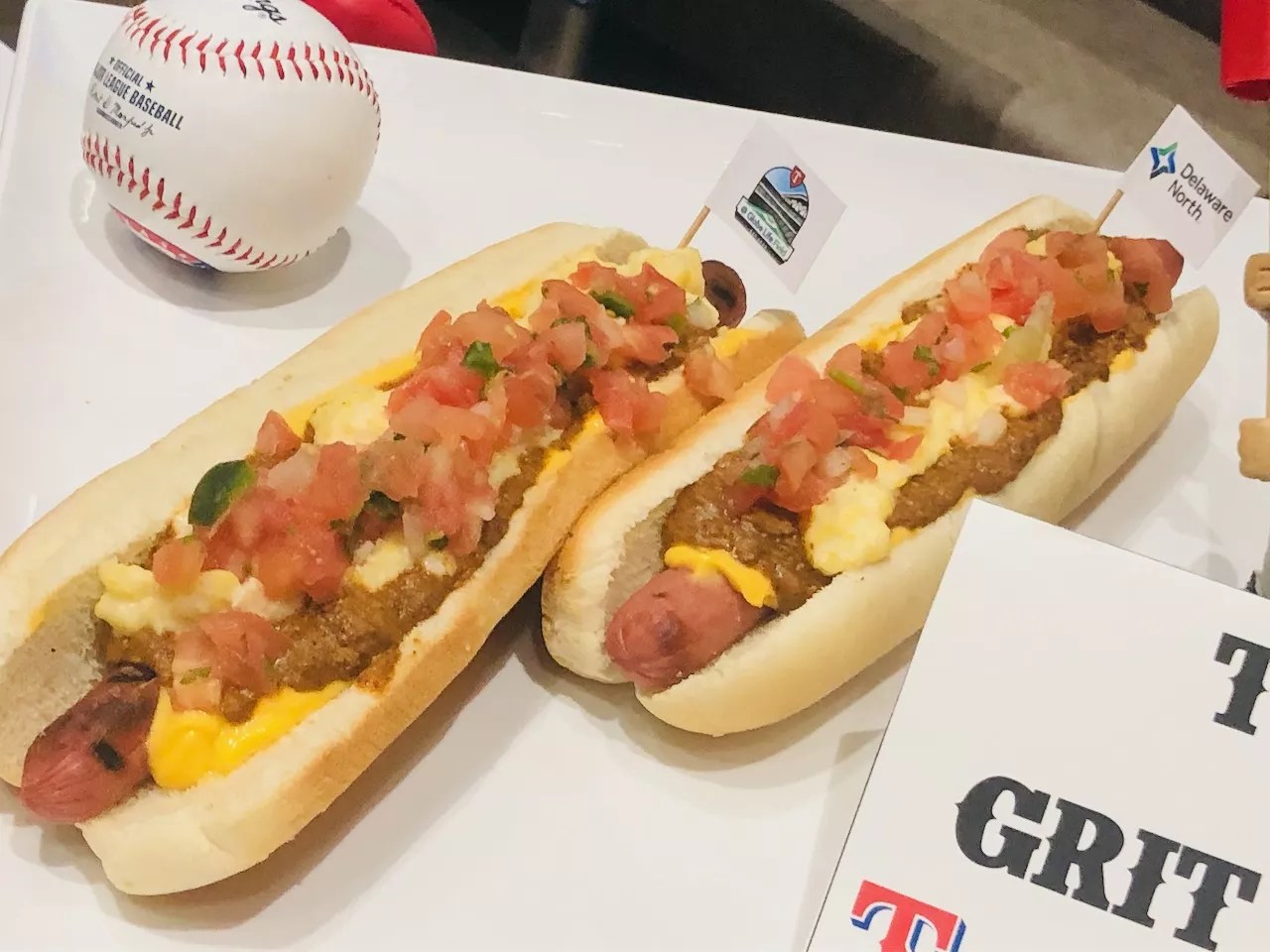 The Grit Dog is an all-beef Nolan Ryan hot dog topped with creamy jalapeño-cheese grits, stadium chili, Rico’s nacho sauce and pico de gallo.