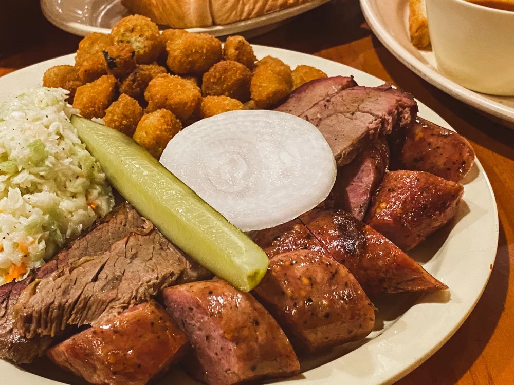 At Smokehouse BBQ German-style sausage is influenced by the local community and twice-battered okra is a standout.