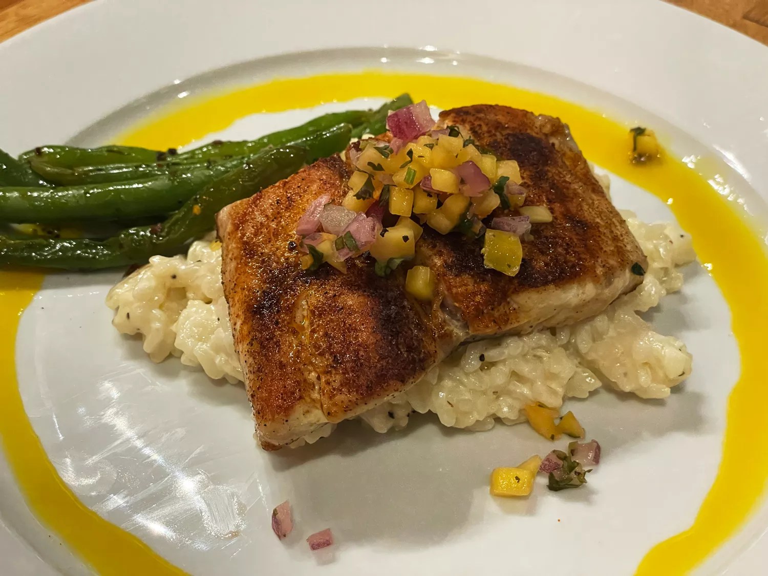 For our main, we were tempted by the Wagyu beef roast, but ultimately we went with the blackened Texas redfish served on a bed of creamy parmesan risotto with a side of green beans and topped with a mango habanero salsa.
