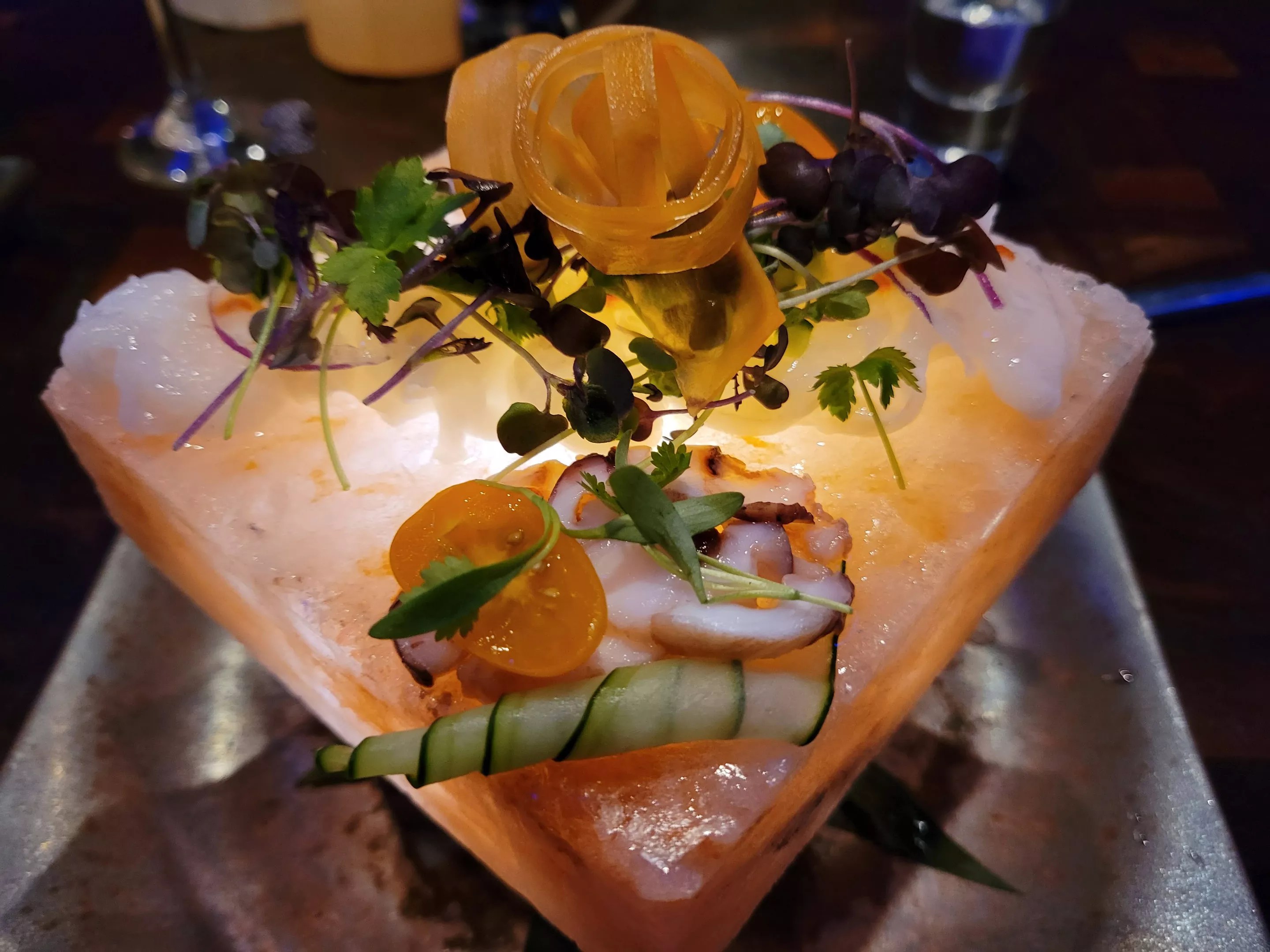 For the final plate tako (octopus) sashimi was set on a large salt rock with glowing lights inside. Although this dish was very Instagrammable, it fell short on taste. The thinly sliced octopus absorbed a lot of the salt from the rock, which made it hard to enjoy.
