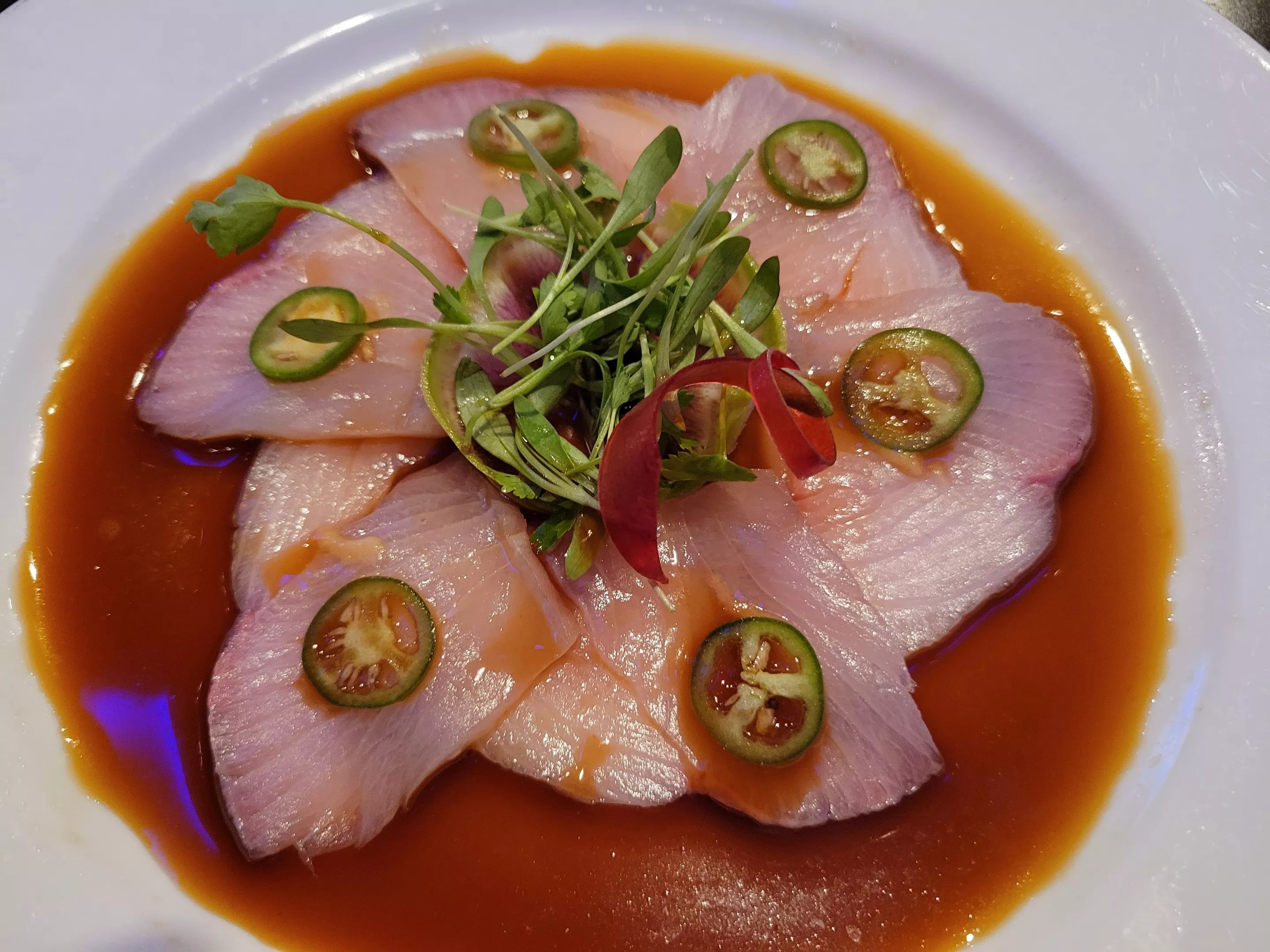 We started with the namesake Imoto sashimi ($18) and a mango snow crab roll ($19). Both were excellent and gorgeous. The yellowtail is set in a bath of citrusy yuzu soy sauce and garnished with raw serrano. The yellowtail was fresh and melted in the mouth. The serrano was a welcomed burn that woke up the taste buds for the zesty flavor of the yuzu and the fresh yellowtail.