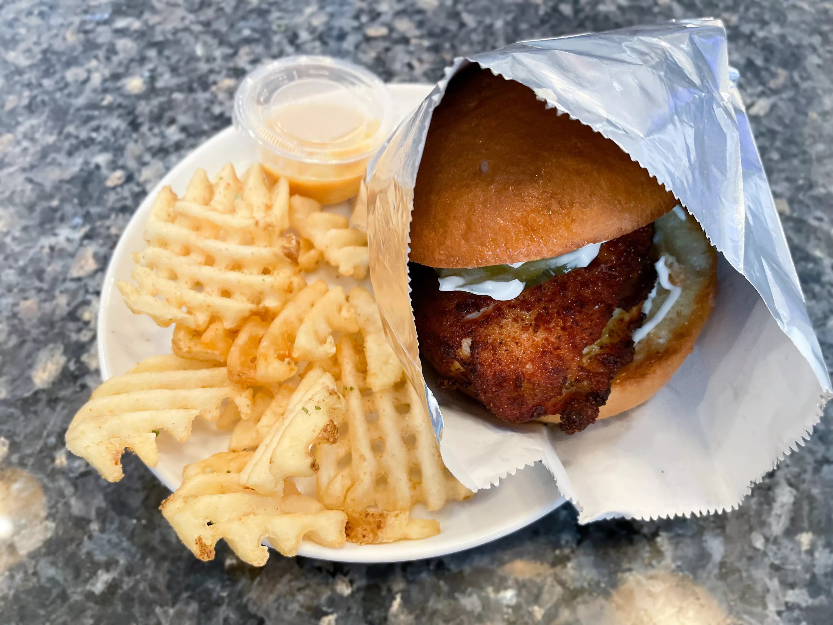 “We joked about the sandwich before the restaurant was even built,” Hassell says. “When it came to service, and making up new recipes and whatnot, I fiddled around with it for a day or two, and the recipe came out very much like a certain chicken sandwich place. And it kind of stuck from there. He [Daugherty] named it, and we’ve been serving it on Sundays ever since.”