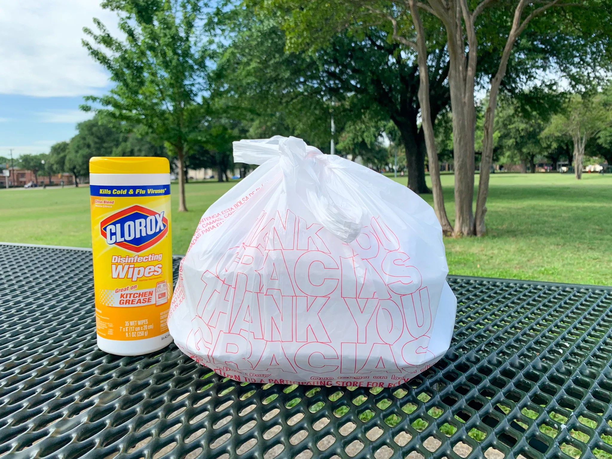 Use the sanitizing wipes you keep in your car to clean the table top – the city of Dallas isn’t sanitizing, which is fair since it has plenty to do and it just furloughed a bunch of people, and 235 employees out of the total 472 were from its Park and Recreation Department.