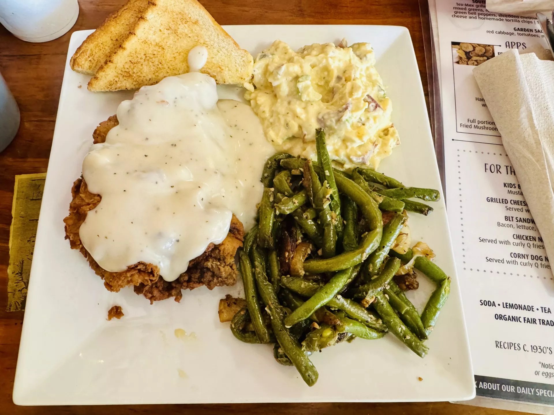Chicken-fried steak, “loaded” potato salad, green beans and toast.