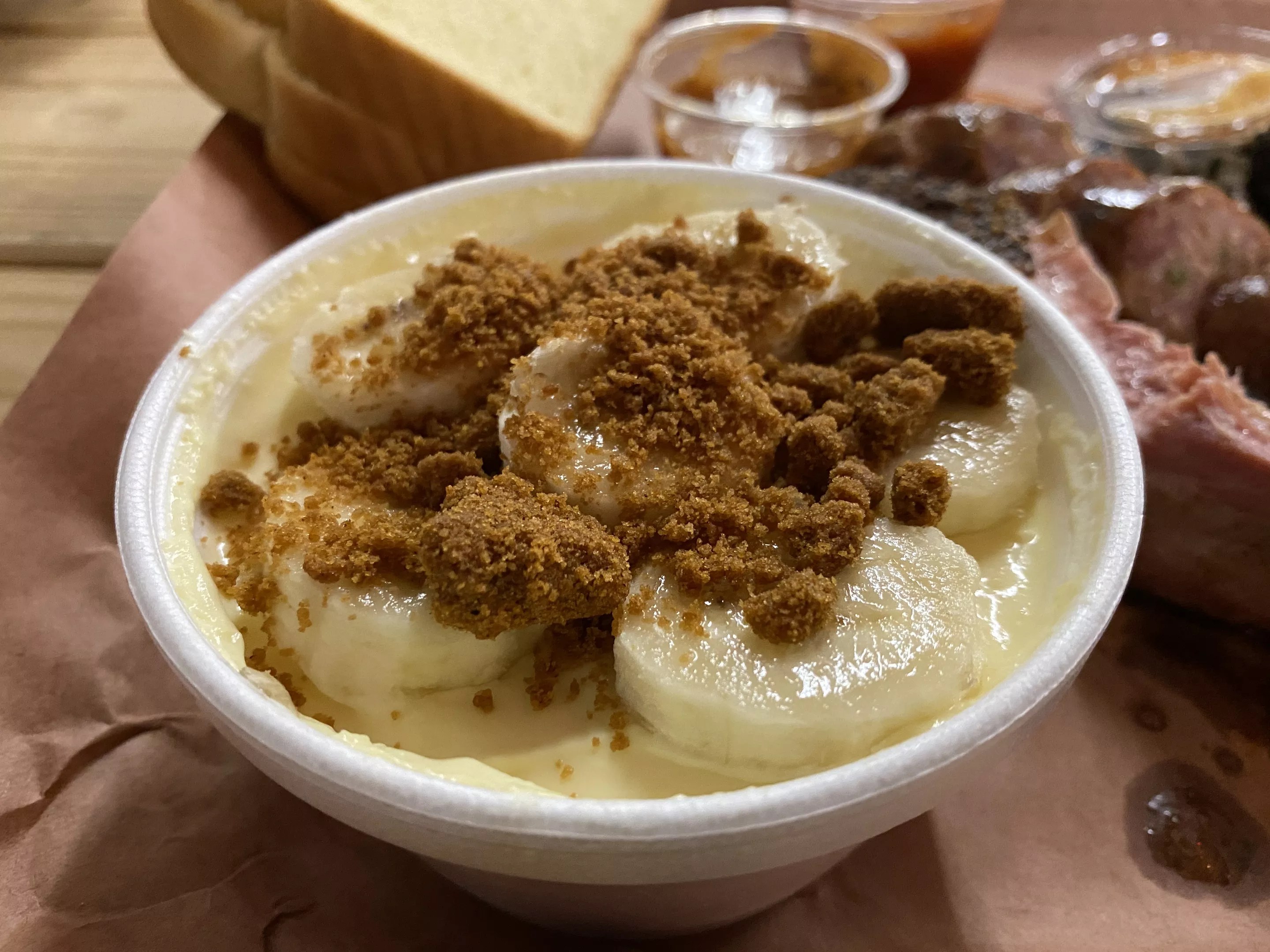 Fresh banana slices and a brown sugar and Graham cracker crumble added to the banana pudding after ordering is just one of Helberg Barbecue’s personal touches.