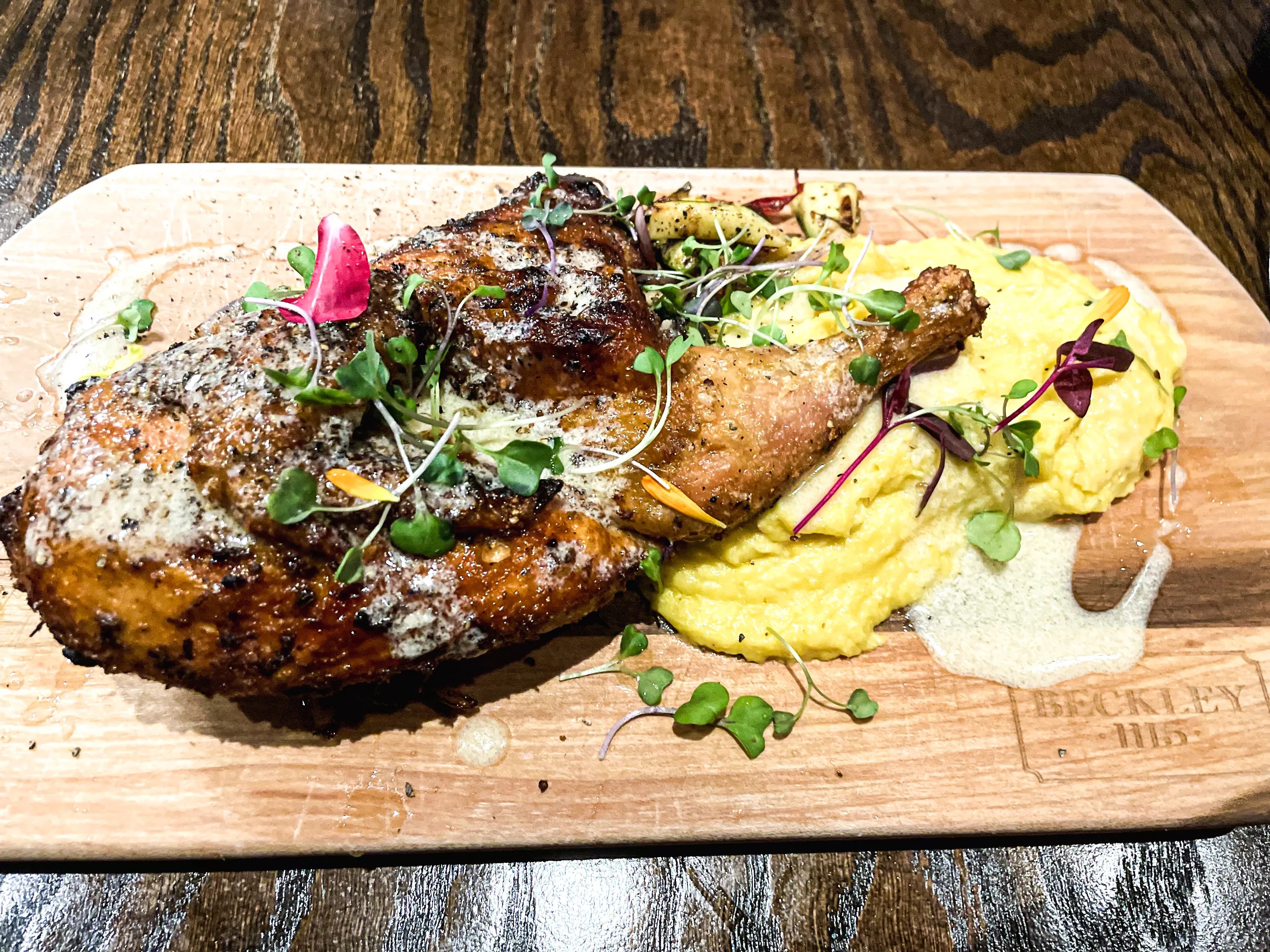 A must-try is the roasted half chicken with a drizzle of a lemon peppercorn sauce, which sit atop grilled asparagus and whipped corn potatoes. The chicken is certainly flavorful, but perhaps the most adventurous part of this plate is the whipped corn potatoes, a golden pile of soft, pillowy goodness.