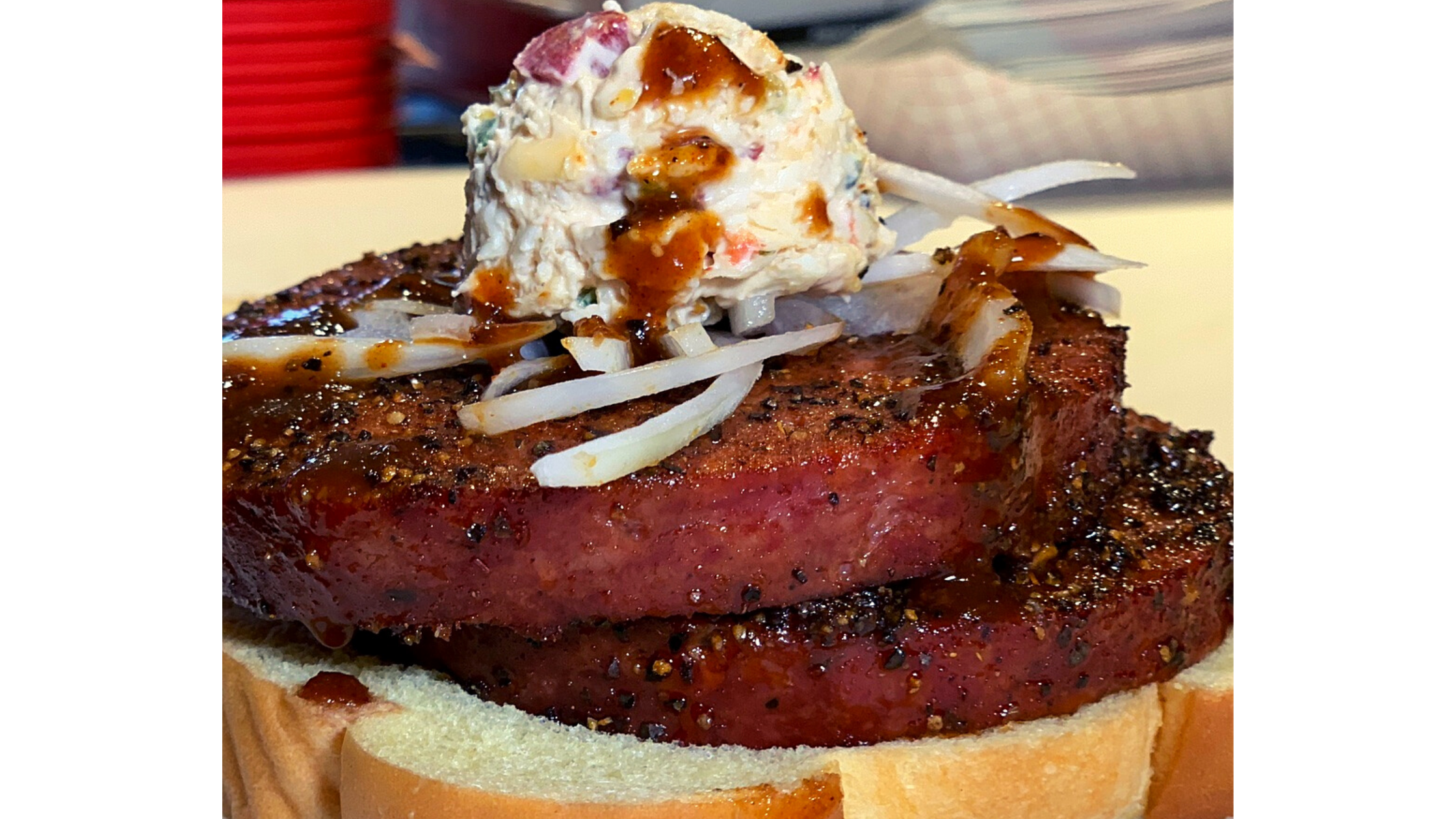 Cattleack Barbeque’s bologna with a spot of pimento cheese on top.