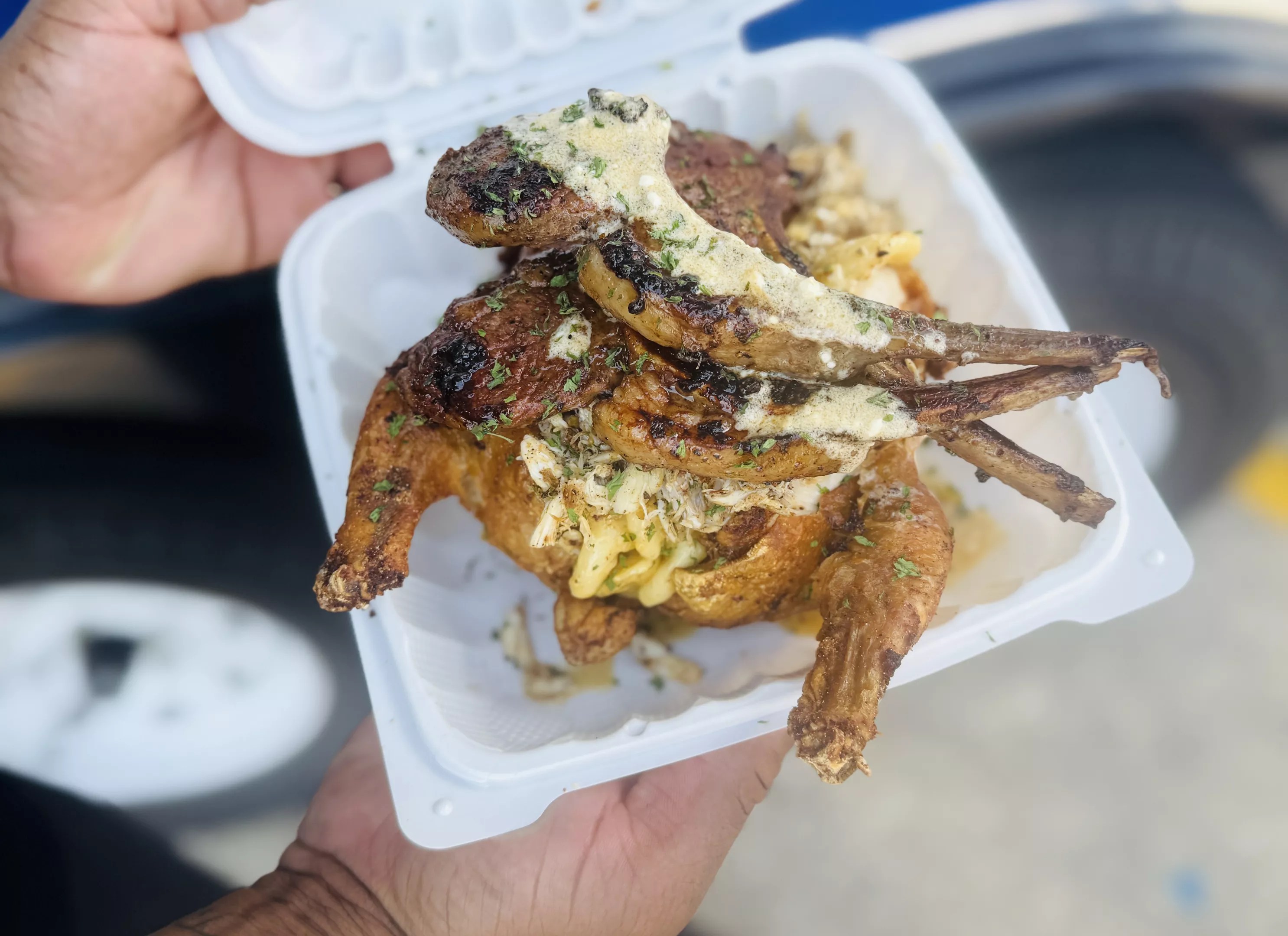 Don’t let the name fool you – these NOLA transplants aren’t a dessert truck anymore, but it’s still a sweet treat for your tastebuds. Born in New Orleans and now based in Texas, The Bell’s Sweet Factory’s unremarkable blue trailer might be one of the most talked-about food spots with zero signage. No menu, no logo: just maxed-out soul food that’s earned a feature on Guy’s Grocery Games and a quarter-million-strong social media following. Deep-fried stuffed hens are their signature, but you can mix and match a plate piled high with proteins like lamb chops, lobster tail, crab, and steak bites, plus sides like candied yams, collard greens and mac and cheese.