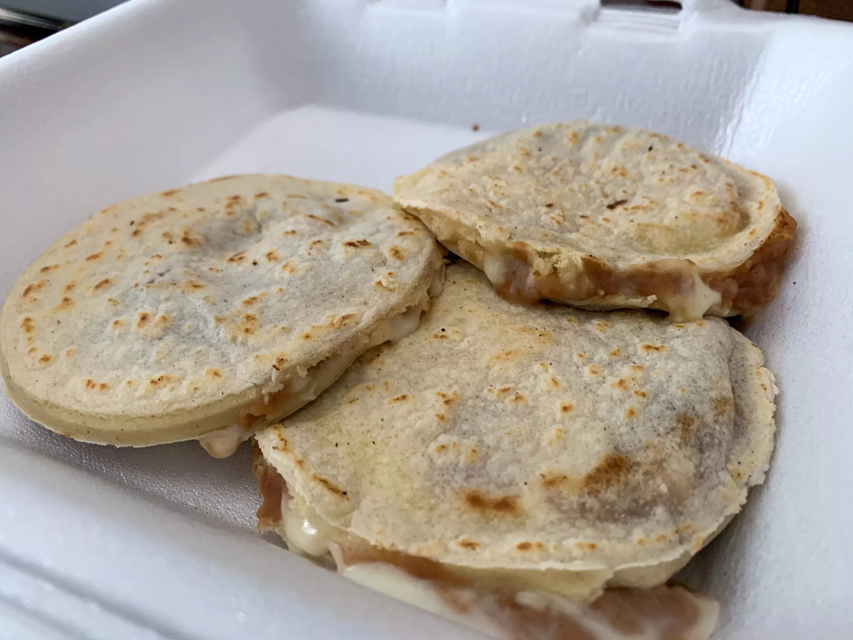 These gorditas do that. Also, the beauty of taking anything with beans to go is that your food is going to stay hot. And these refried beans hugging the plentiful cheese in these gorditas all melt together when you take a bite through the just-crisp-but-still-soft top exterior of the gordita.