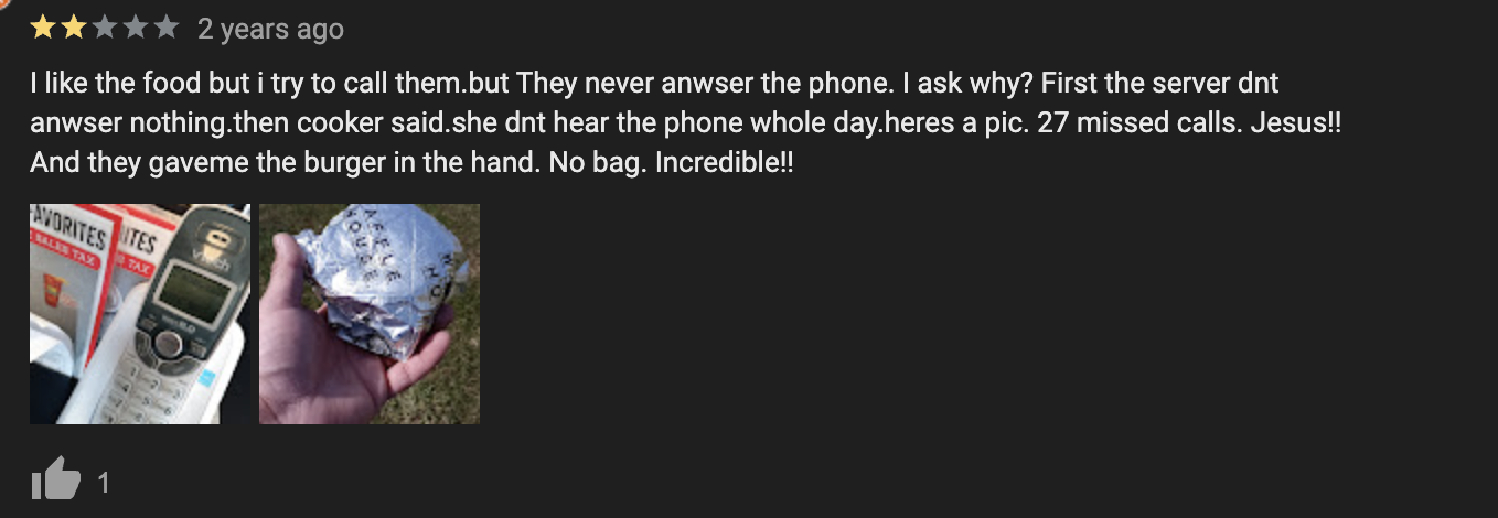 Our favorite review based on everything but the food took issue with 27 missed calls on the landline. This customer was even bold enough to walk into the restaurant, find the phone and snap a photo (after apparently calling 27 times and not getting an answer). GP goes hard like that. And why is he mad about not getting a bag for his burger? That’s conservation.