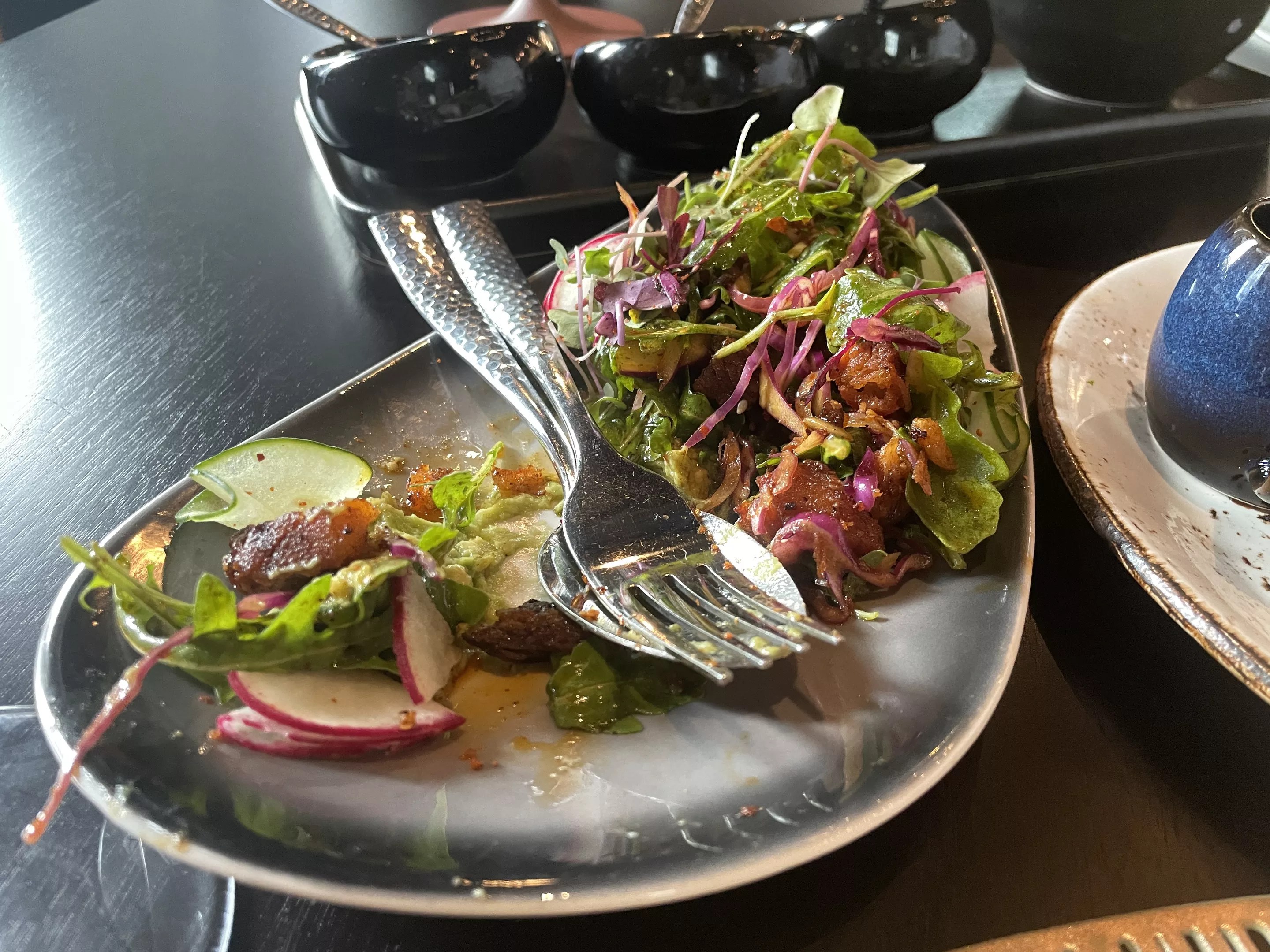 What we ordered had some refreshing elements (avocado, cabbage, radish, morita sauce and red onion), but we weren’t expecting those things to be the focus of the dish. It was actually an arugula salad with a bit of pork belly, and arugula isn’t even listed in the item description.