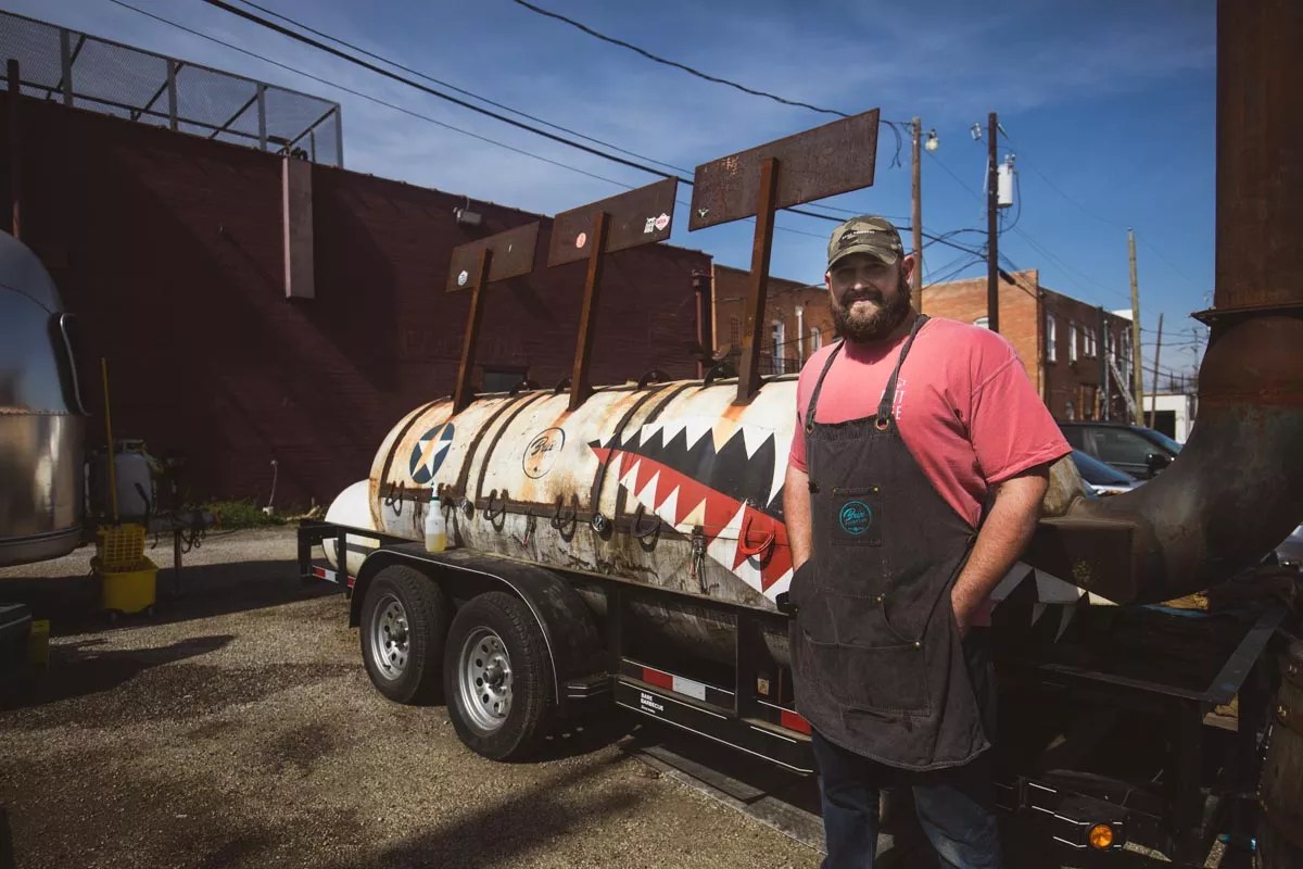 Trevor Sales, owner and pitmaster of Brix Barbecue, stands in front of his smoker, The Brisket Bomber at his popup in 2020.