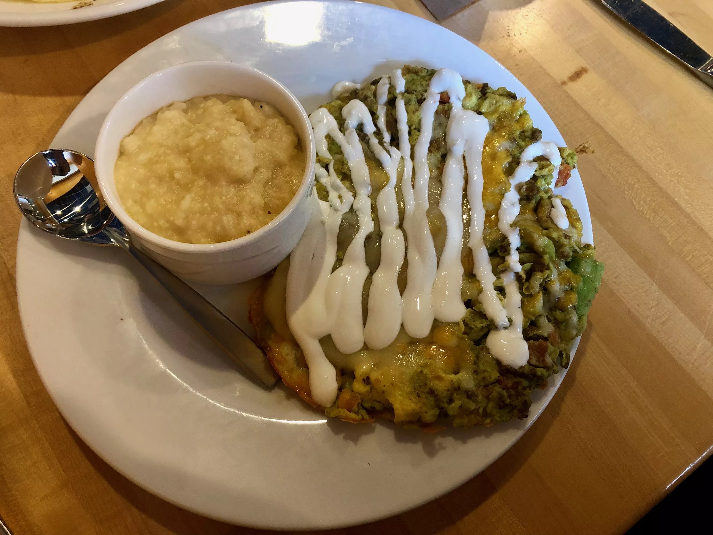 With the scramblers, you get breakfast potatoes or cheese grits and toast, pancakes or an English muffin. There’s nothing wrong with the grits. They do come out at the right consistency, so you know someone actually put care into them. And they are cheesy. But there’s nothing special about them – not when there’s so much else on the table.