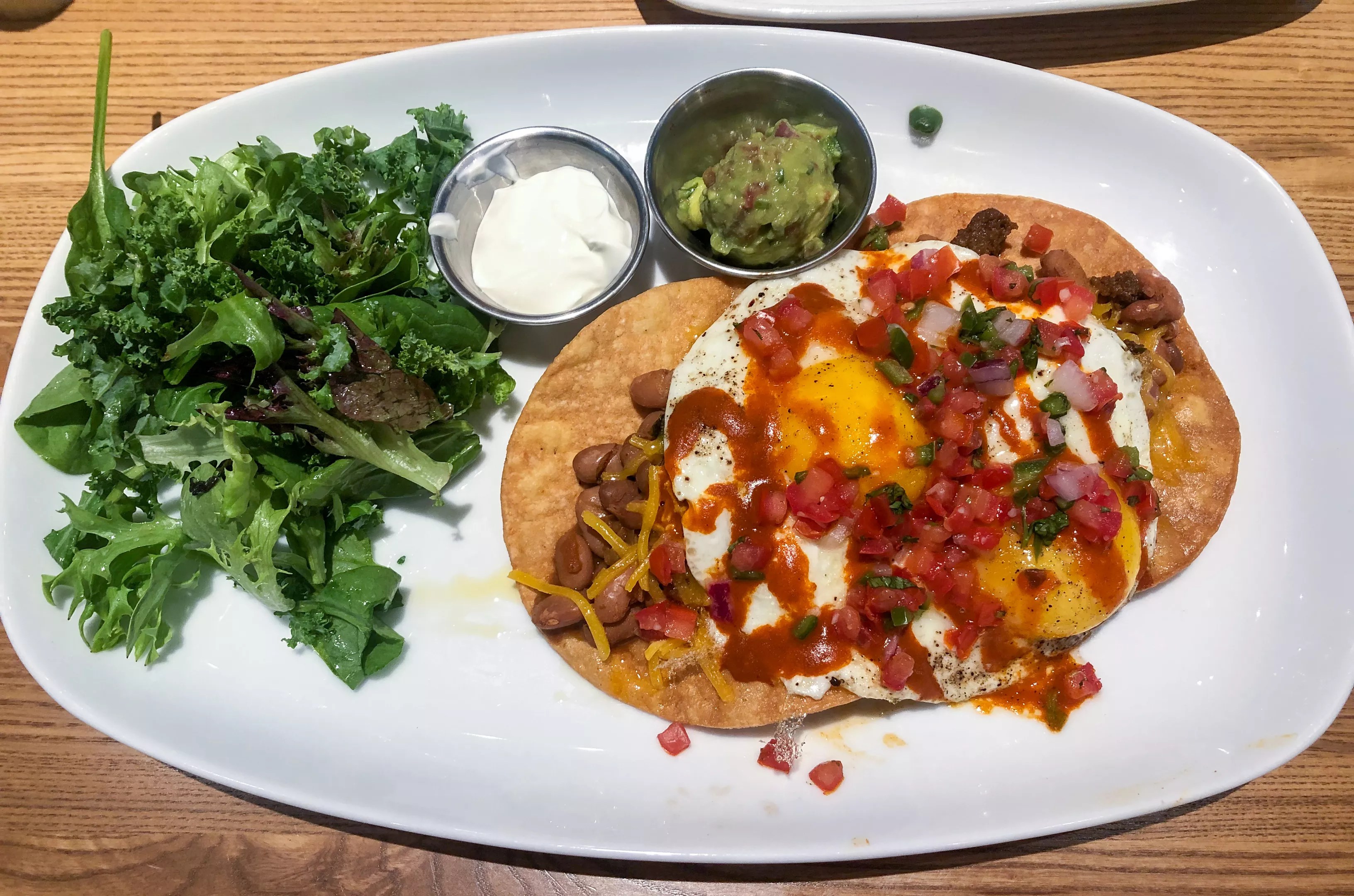 A few items are under the “chef’s favorites” on the menu, one of those being the huevos rancheros ($13). The ranchero beans kind of take over the experience, causing the chorizo that’s allegedly there to disappear. But the overall flavor with cheddar, peppers, onions, pico and hot sauce comes together as it should. Adding the provided sour cream just makes it better.