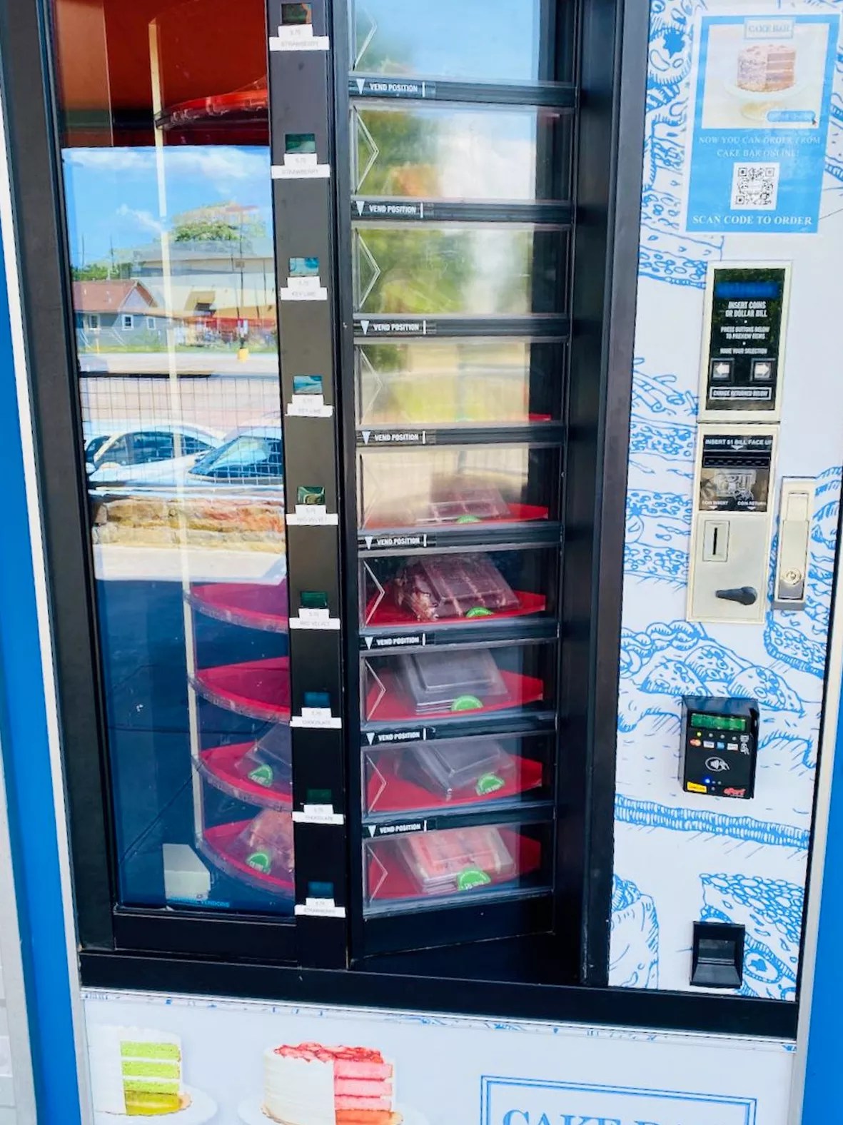 The cake vending machine outside the Cake Bar takes dollars, quarters or plastic.