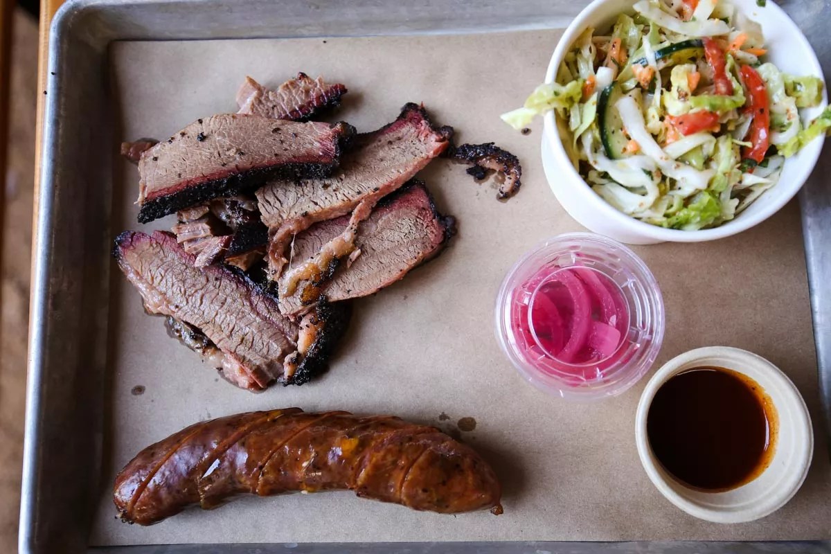 Like the restaurant, the menu is minimalistic. Just four meat choices are featured: brisket, turkey, a cheddar-jalapeño sausage and pulled pork. If you prefer your barbecue on a bun, any of the proteins can be ordered as a sandwich, but most people will likely avail themselves of a two-meat ($14) or three-meat ($17) plate, which comes with a side of beans or a mustard-and-vinegar coleslaw. The menu also touts stuffed jalapeños for just two bucks, roasted corn on the cob for $3.50 and an after-5 p.m. special of brisket nachos ($9). Since we rolled up just as the clock struck 5, we had to try the nachos, and we also got a two-meat plate of lean brisket and sausage with slaw. We rounded out our order with the roasted corn, then grabbed a table to dig in.