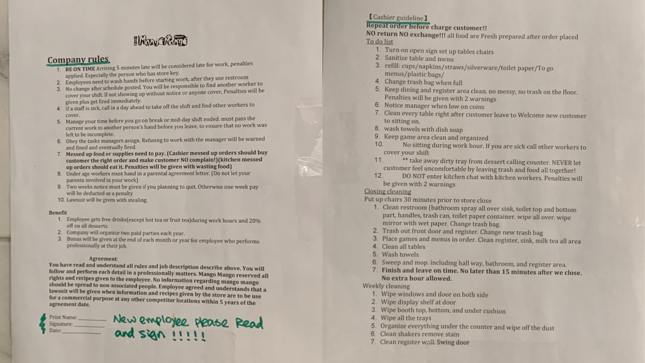 Additionally, the company rules state that if an employee does not give a two weeks’ notice when resigning, one week of pay will be withheld. Also, cashiers are not allowed to “enter kitchen chat with kitchen workers or penalties will be given.”
