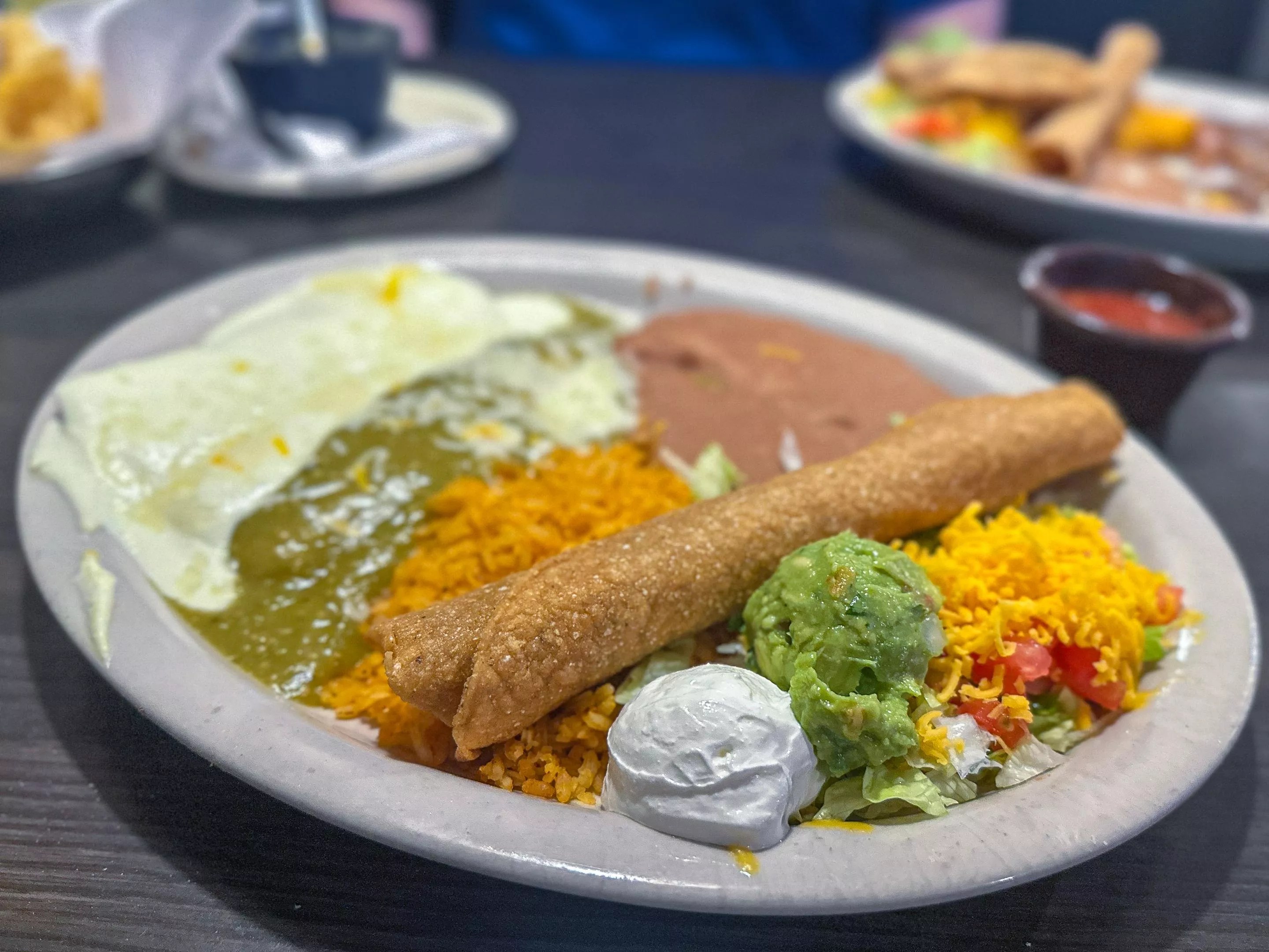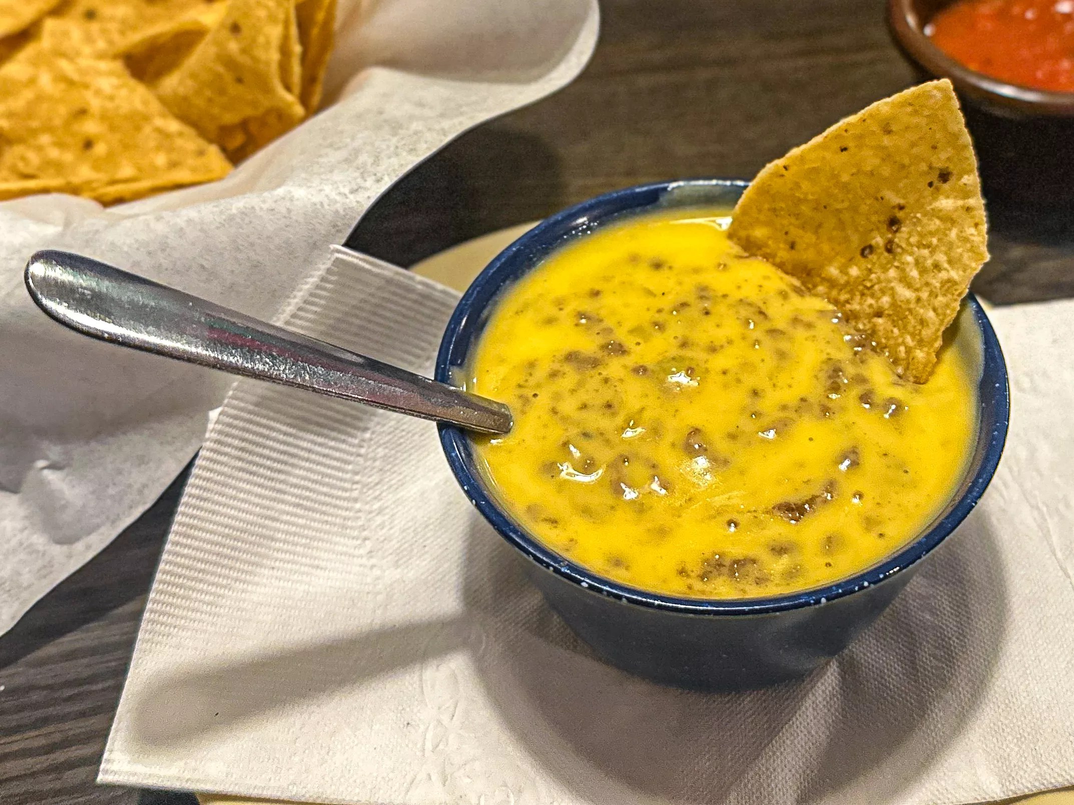 Relatively inexpensive lunch specials clock in around $10 and are served seven days a week, along with breakfasts that are served all day. (We’ve never had the menudo, which is served on the weekends only).  We usually come for dinner and start with a frozen margarita that goes for $4.50. In a world of $20 cocktails, this is a steal and a half. We added a small queso with beef for our chips; it’s small, but we were still unable to finish it.