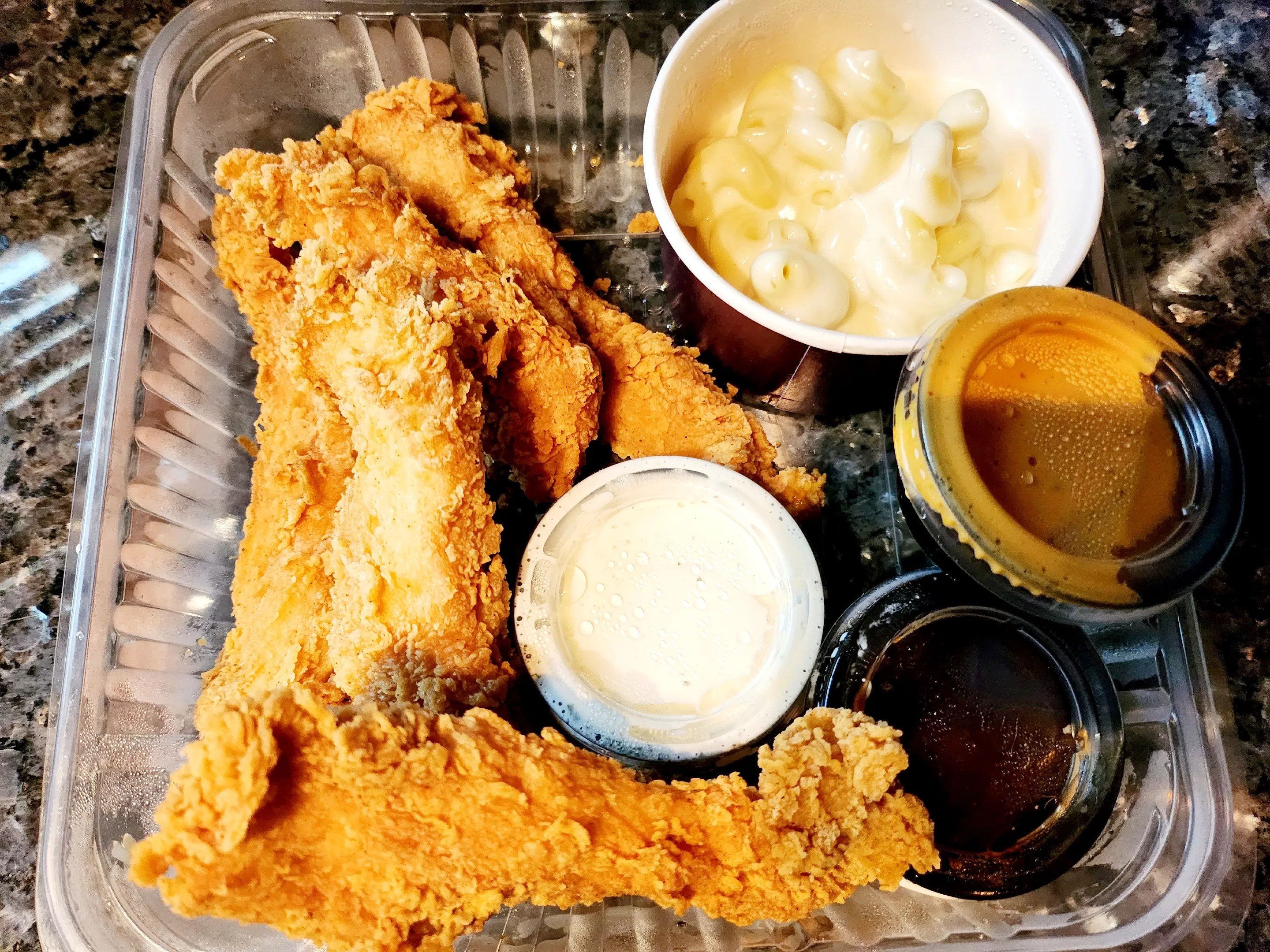 First, let’s get the sides that came with the crispers out of the way. A lifeless white cheddar mac and cheese was in a tiny container, barely half-full, and an order of Texas cheese fries (we upgraded from regular fries) came with our crispers. The fries were covered in melted shredded cheese, jalapeños and green onions and, like the mac and cheese, were uninspiring. Obviously, these would have been better eaten tableside as soon as they came out of the kitchen. Alas, they couldn’t survive a less-than-10-minute ride away. By the time we pulled the fries out, the melted shredded cheese had melded the fries into a unified object we could’ve played catch with in the yard.
