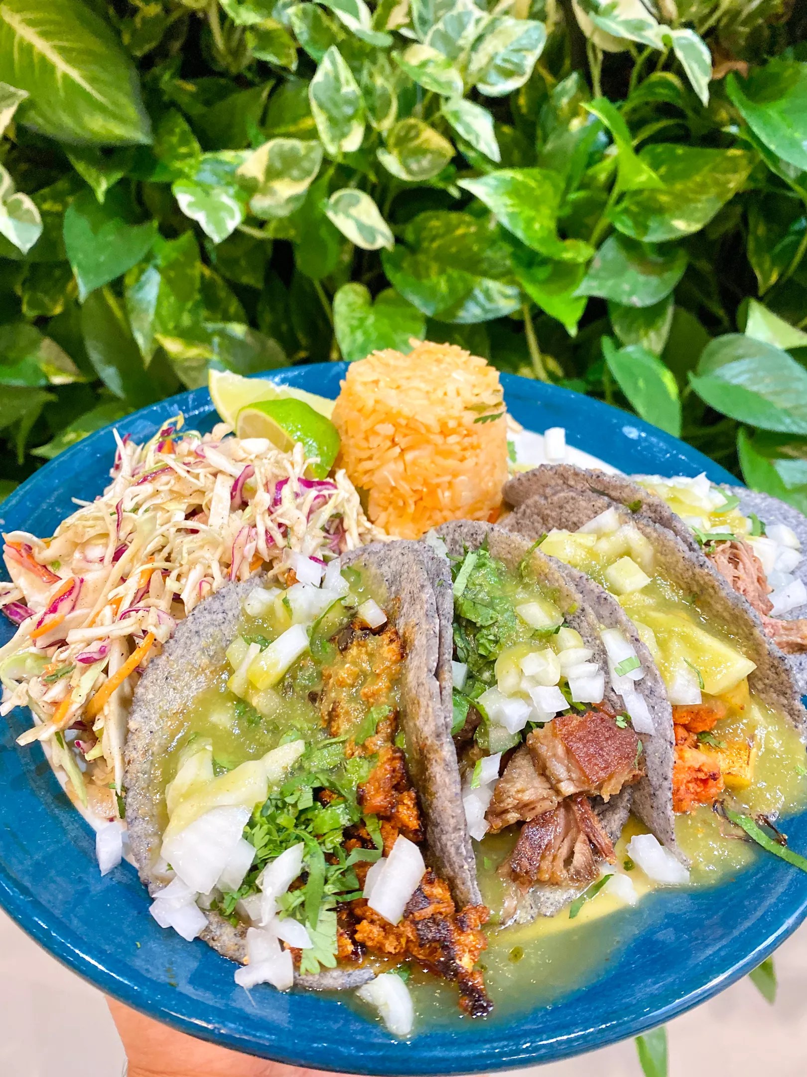 Tacos come in an order of three ($9.85 to $10.85) with Mexican red rice and Chimalma coleslaw, and there are many proteins to choose from. They offer carnitas, brisket, chorizo, nopales, calabacitas (squash), hongos (mushrooms) and the soy pastor taco.