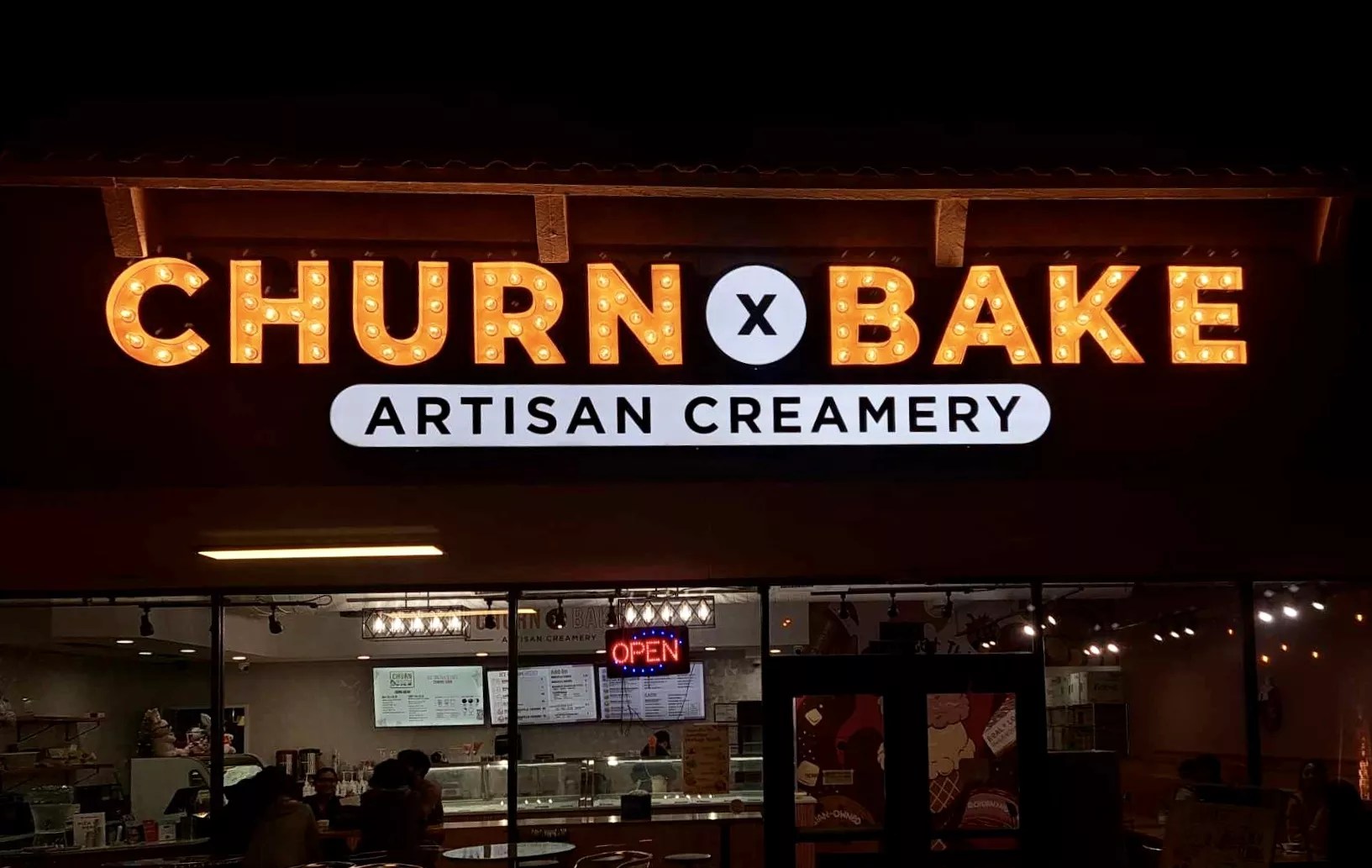 The marquee lights on Churn and Bake’s sign are a welcome sight on any night.