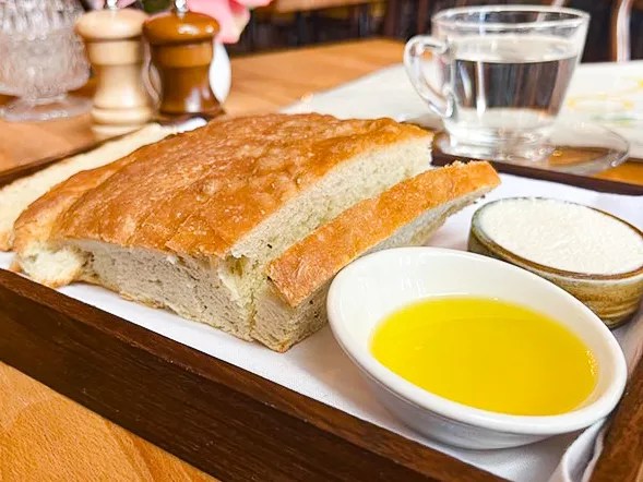 House-made focaccia comes with olive oil and whipped ricotta dips.